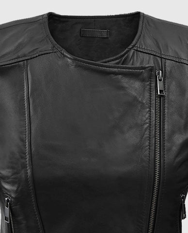 Women's Black Collarless Leather Biker Jacket Sale