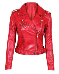 Introducing the Negan Leather Jacket, a chic and edgy biker jacket designed for women. In definitive Red, this jacket is crafted from real leather, ensuring durability and style.