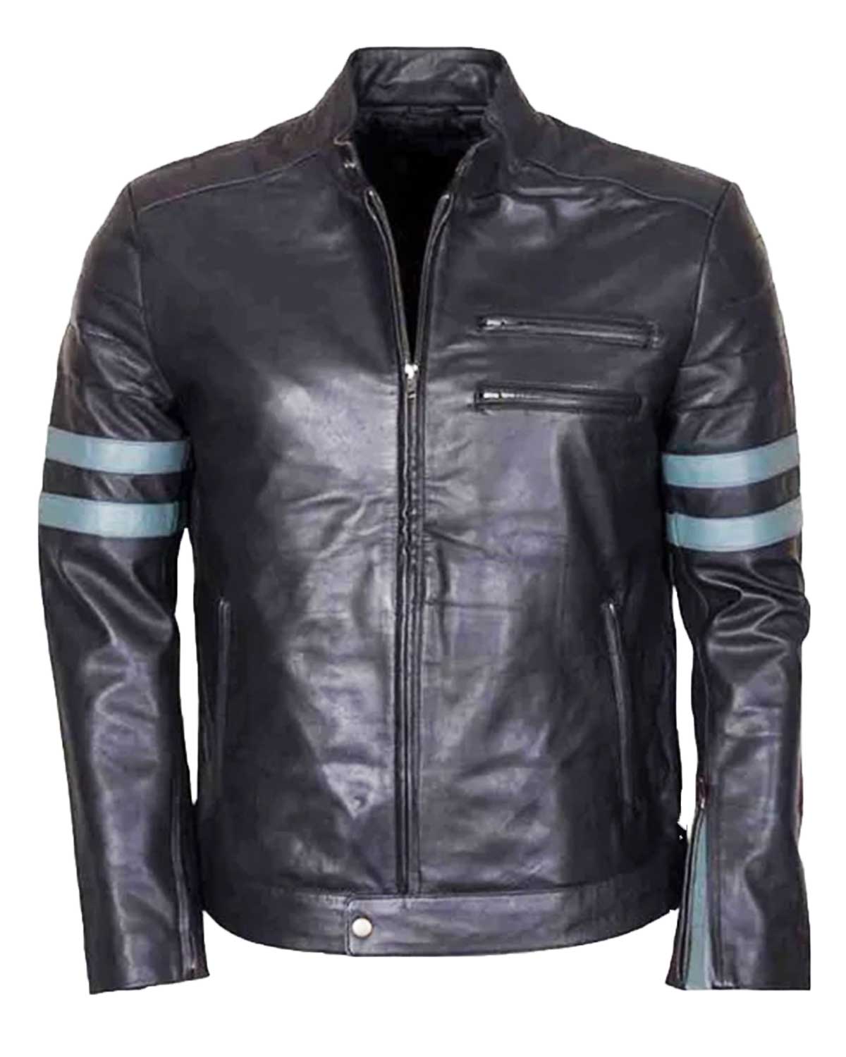 Step into the world of revolutionary style with the Men's Blue Stripe Mayhem Retro Black Biker Leather Jacket.