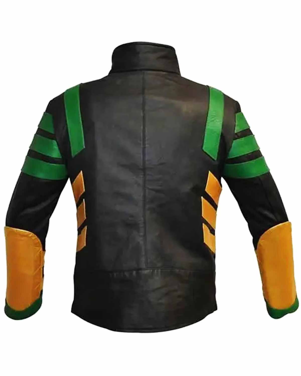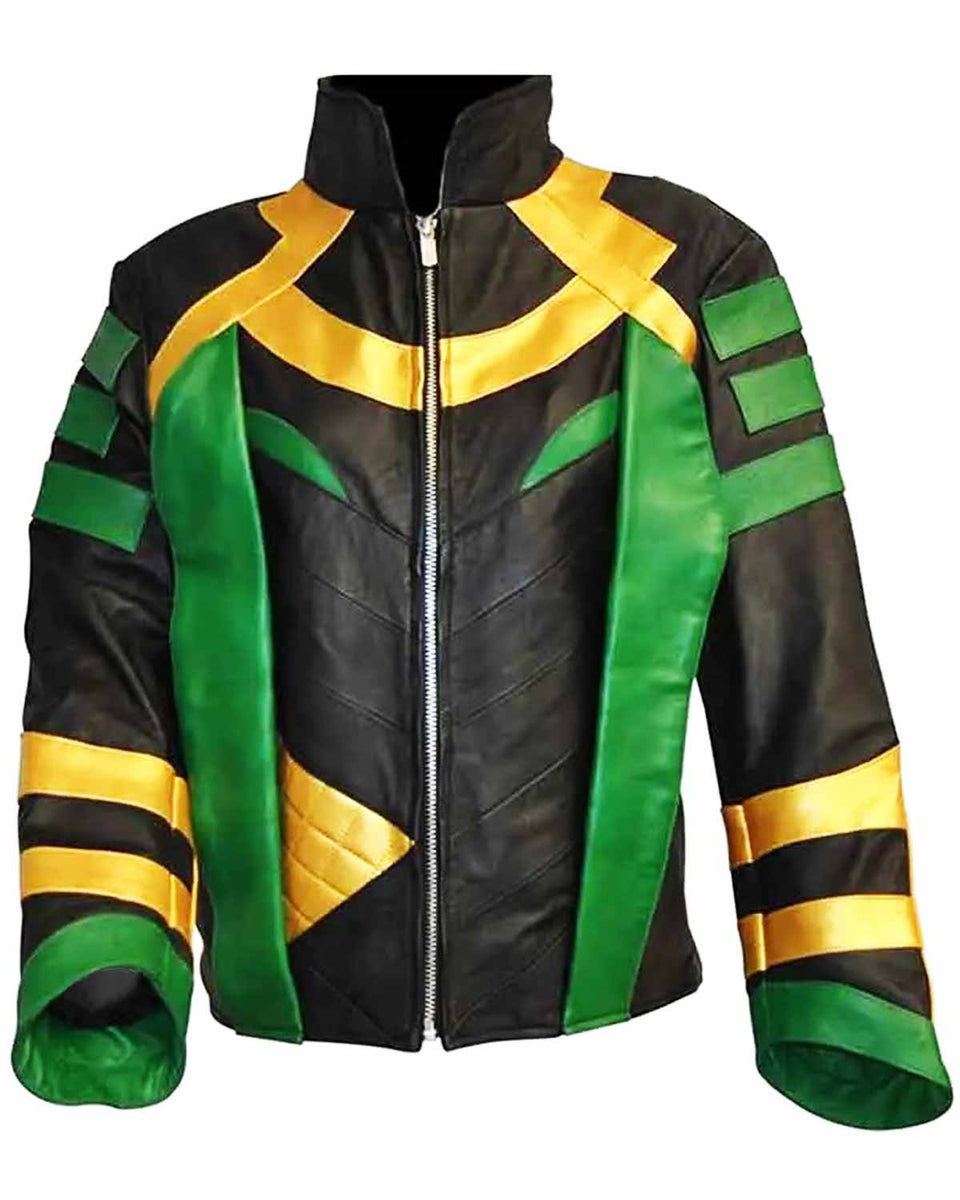 Full sleeves with open hem cuffs provide a classic design. The jacket's unique combination of black, yellow, and green colors captures Loki's signature look. Whether you're a Marvel fan or appreciate bold fashion, the Ragnarok Loki Black Leather Jacket statement piece embodies style, comfort, and the mischievous charm of the God of Mischief. Elevate your wardrobe with this distinctive Loki inspired leather jacket.