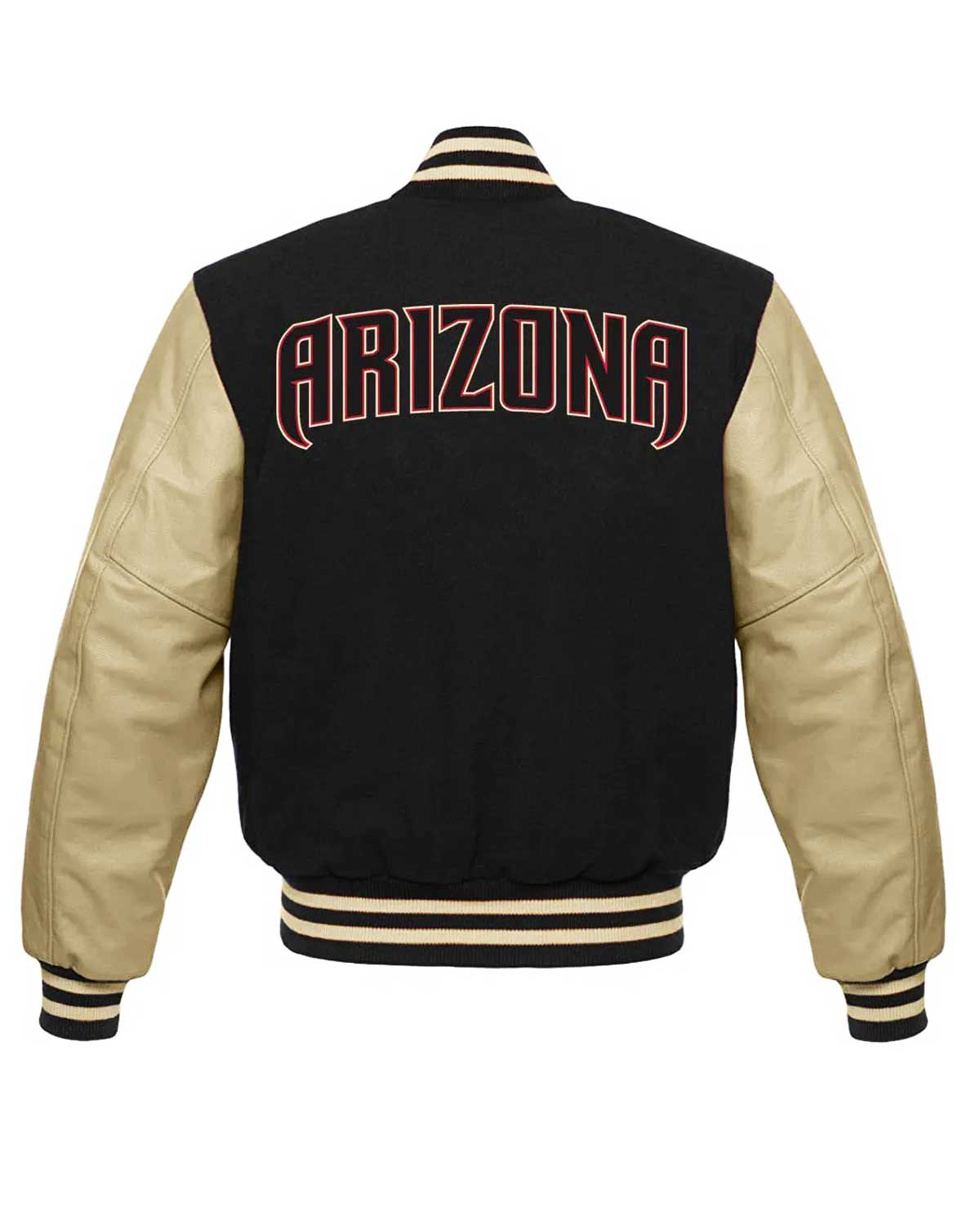 Crafted with a woolen body and genuine leather sleeves, it boasts a rib-knitted collar, long sleeves, and rib-knitted cuffs for a classic letterman jacket look. The snap-tab buttoned front closure adds a touch of vintage charm, while the soft viscose inner lining ensures a comfortable fit. Show your team pride with fine quality stitching that guarantees durability. Complete with two side pockets, this Arizona MLB Letterman Jacket seamlessly blends sportsmanship and fashion.