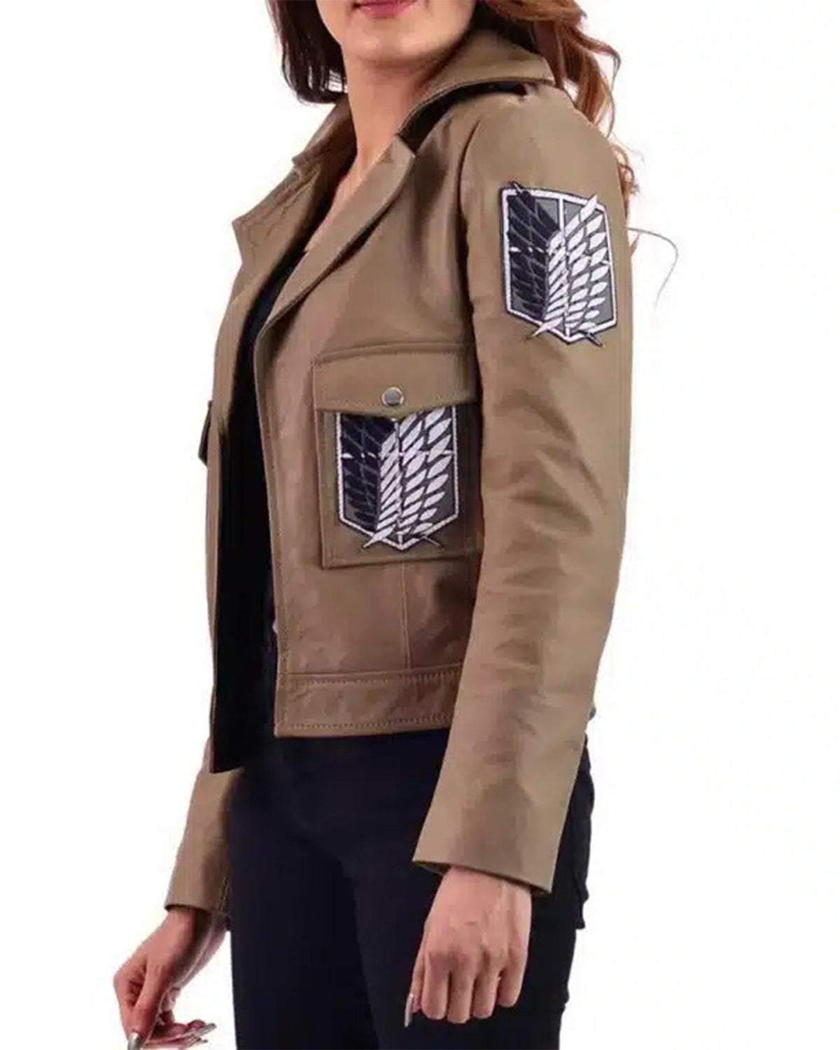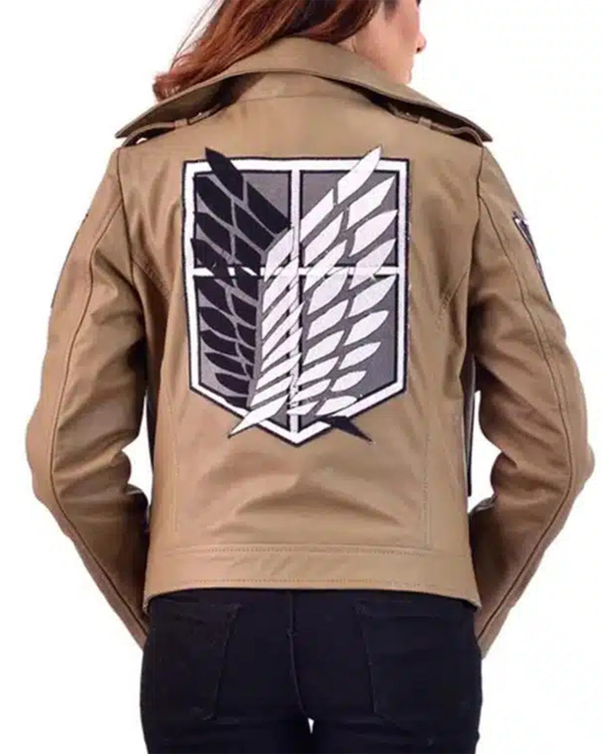With our Attack On Titan Survey Corps Women Leather Jacket, you can embrace the spirit of the Survey Corps. Made with real leather and a striking khaki hue, this jacket pays homage to the venerable television series. The embroidered logos at the front, back, and shoulders display your devotion to the Survey Corps, while the open front design and shoulder epaulets offer a dash of military-inspired flair.