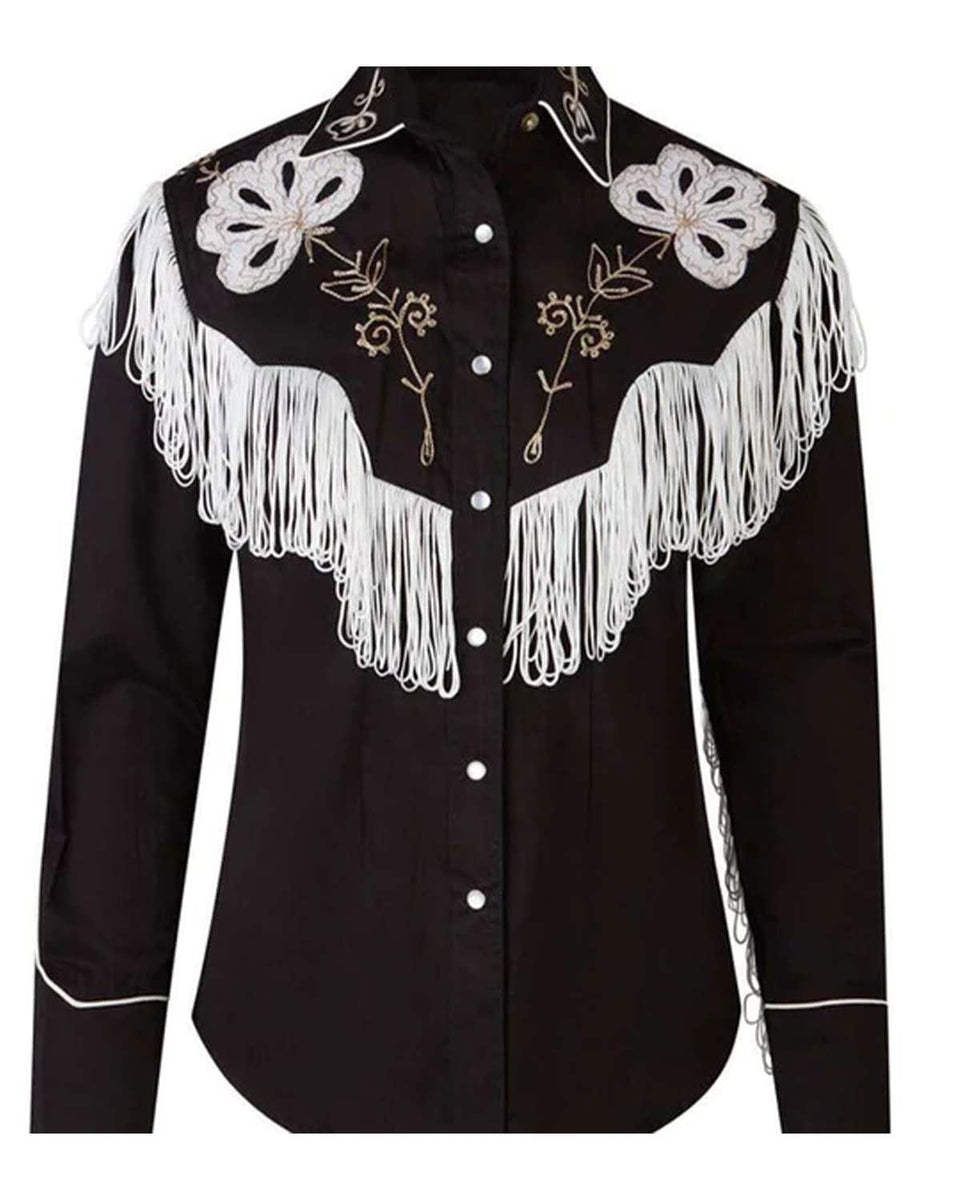 The shirt, which is a classic black color, has a unique pattern with fringe styles and floral prints that give it a fun and stylish touch.