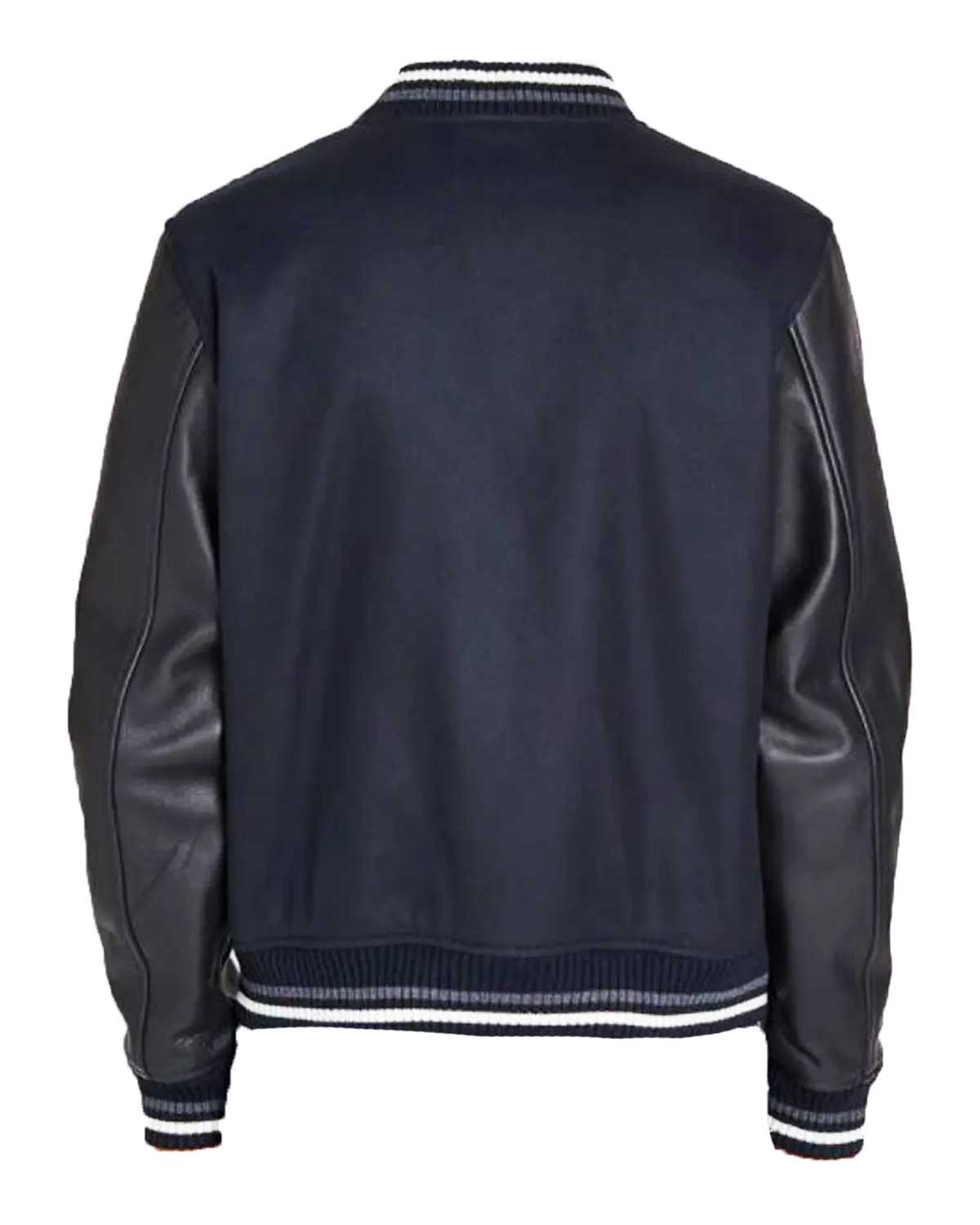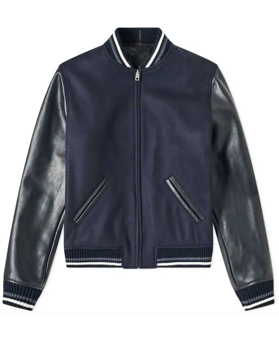 Remark with the Blouson Copper A.P.C. Blue and Black Varsity Jacket. Prepared from a luxurious wool mixture with 100% real black leather sleeves, this Blouson Copper Blue and Black Varsity Jacket seamlessly incorporates fashion and sportiness. The navy blue body with black sleeves in a traditional varsity style exudes timeless pleasure.