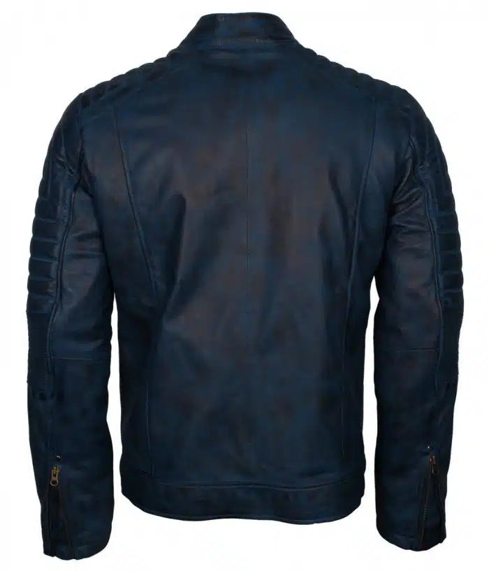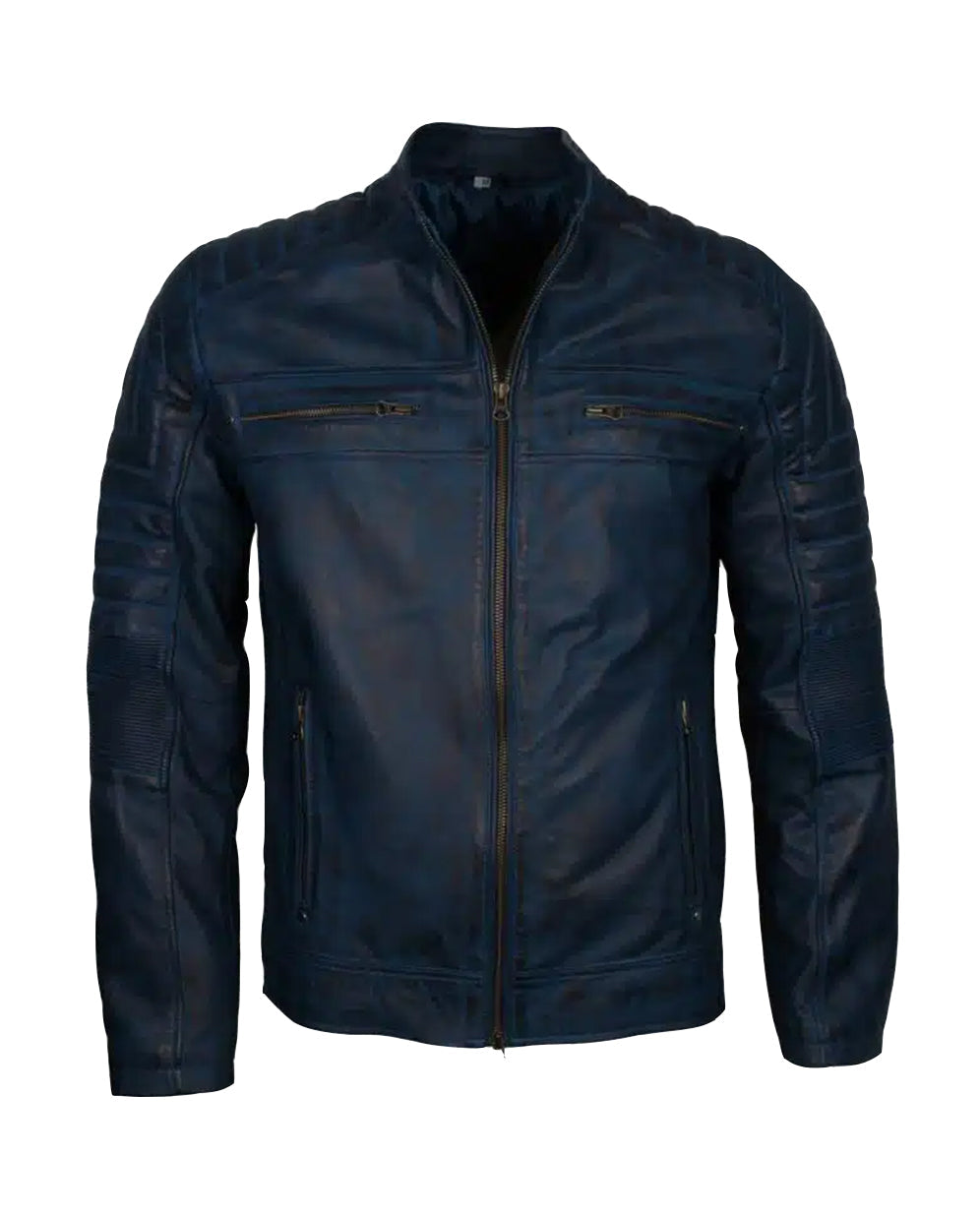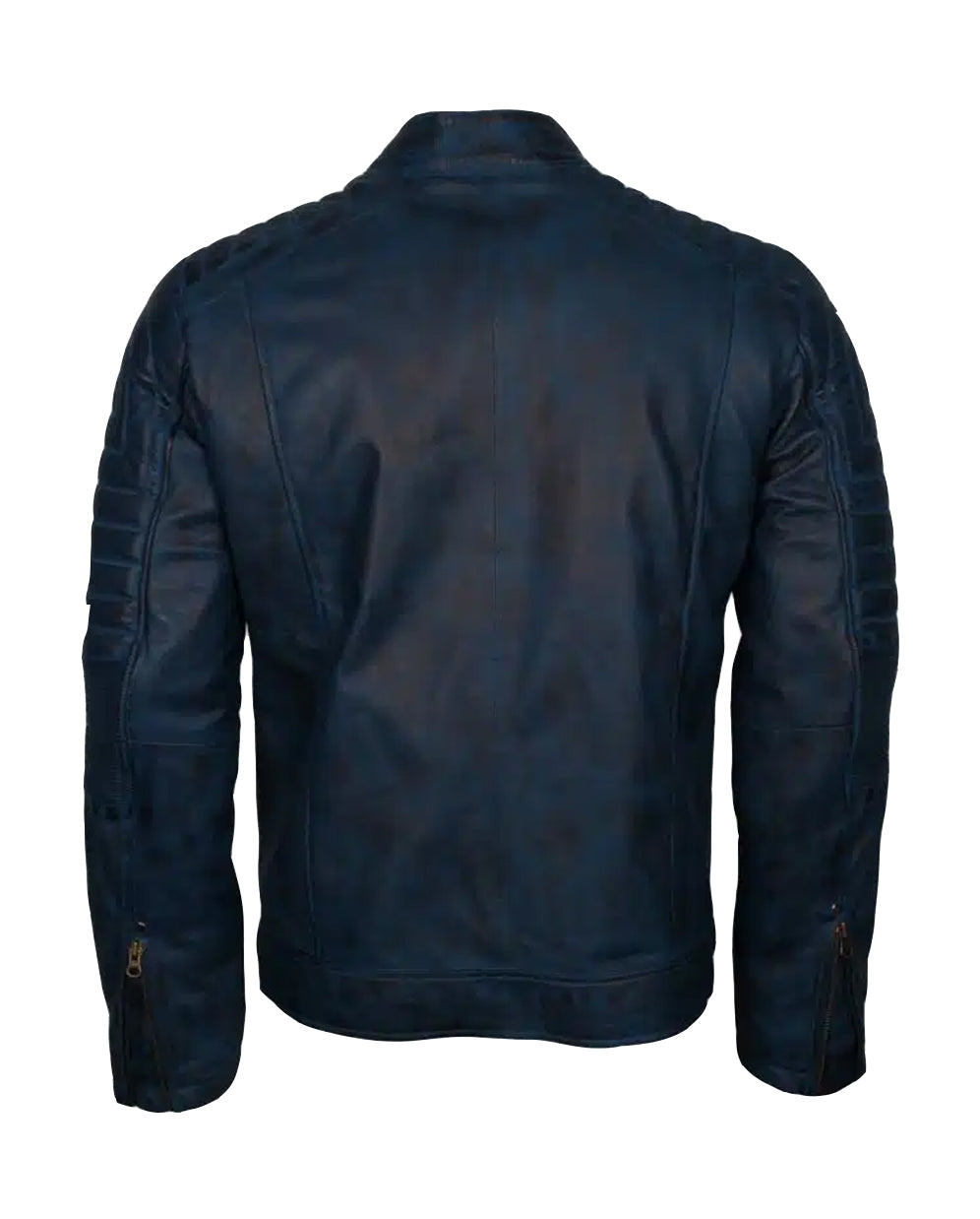 The quilted viscose lining ensures both comfort and warmth, making it suitable for various occasions. With a stand-up collar, the Mens Blue Vintage Leather Jacket, exudes a classic vibe, while the four outside and two inside pockets provide practicality and convenience.