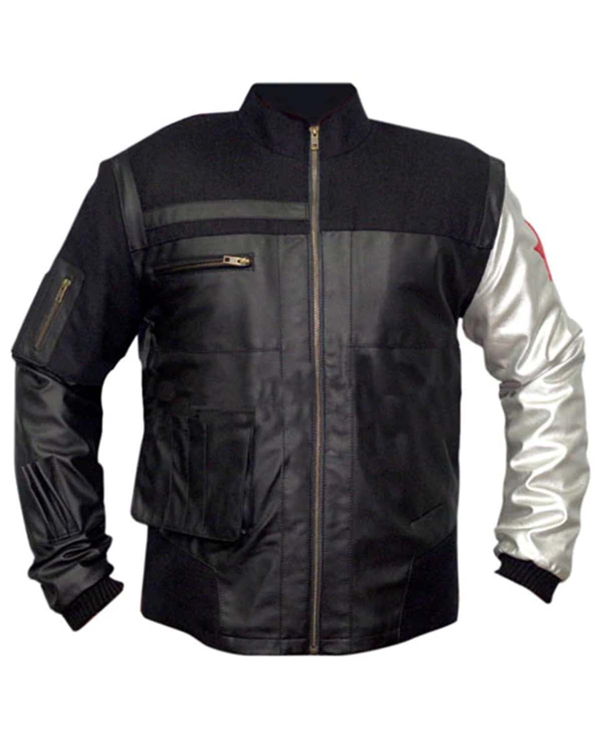 The jacket has an asymmetrical style, and it comes in a classic black color, capturing the essence of the Winter Soldier's character. With both inside and outside pockets, it offers practical storage space. The sleeves are decorated with silver padded details, contributing to the overall appeal. Whether you're a fan of the film or simply looking for a fashion-forward statement piece, this Iconic Winter Soldier Jacket is a must-have for those seeking a bold and iconic addition to their wardrobe.