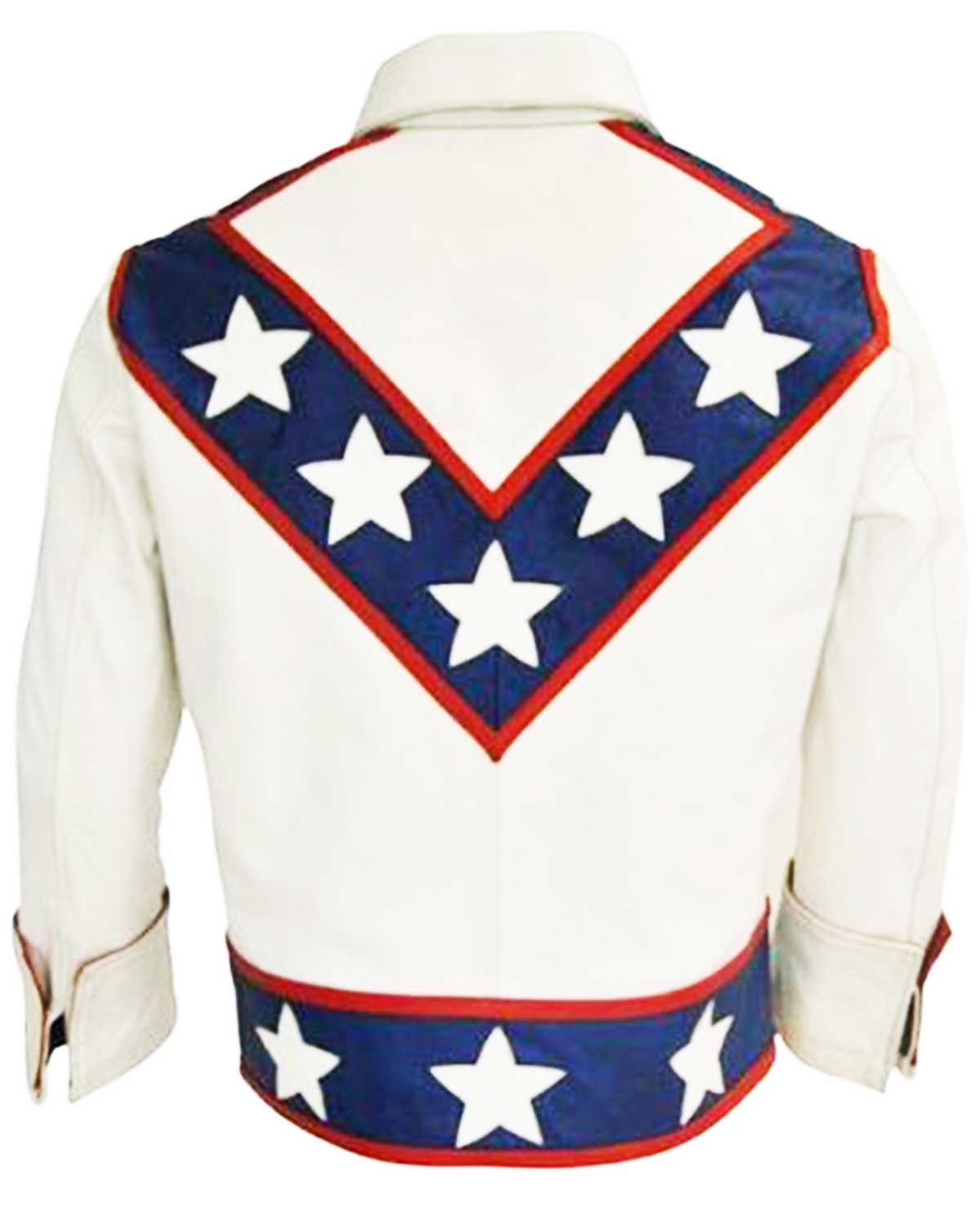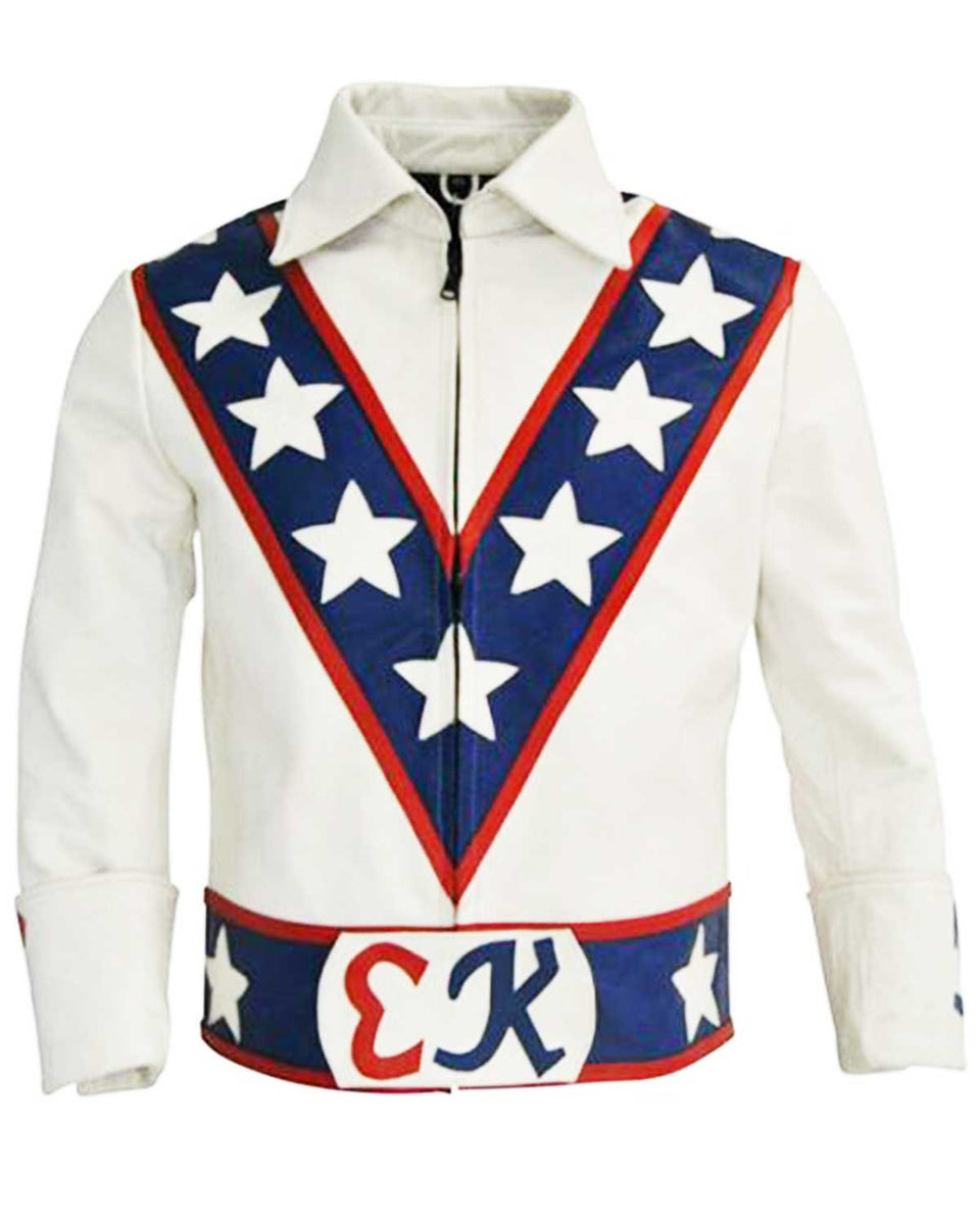 Channel the spirit of Evel Knievel with the Daredevil Evel Knievel White Leather Jacket. Crafted from genuine leather, this jacket showcases a fusion of bold style and durability. The soft viscose lining ensures comfort, while the fine stitching and full sleeves add a touch of refinement.