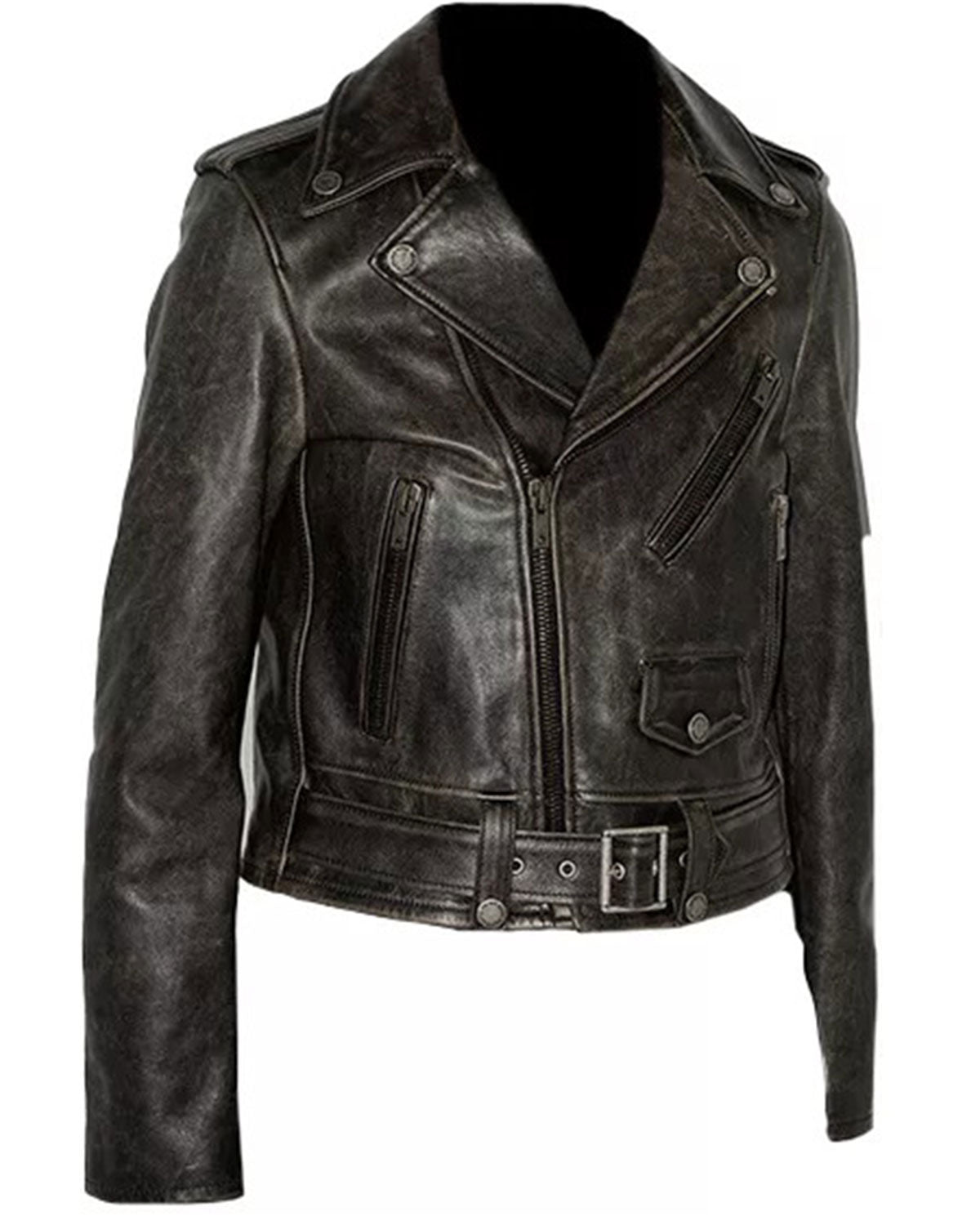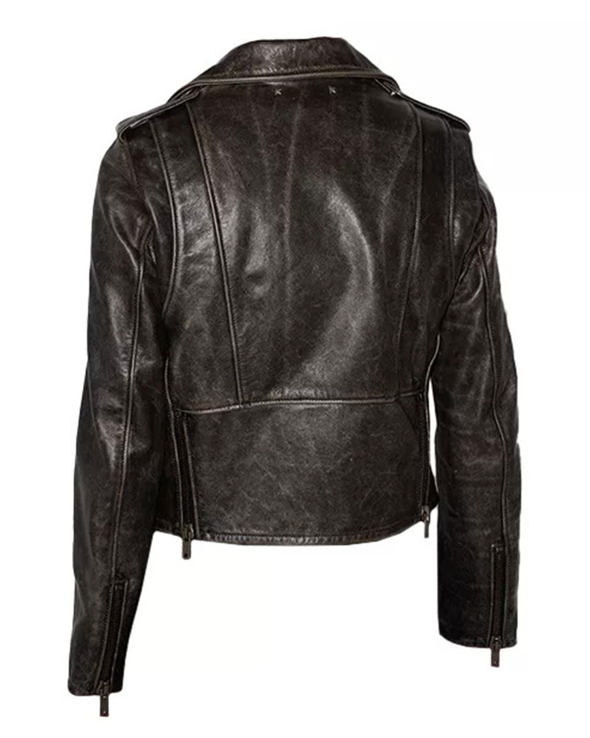 Showcasing the Women's Dark Brown Distressed Leather Jacket This jacket, which is made of premium leather, has a deep brown color that lends refinement to any outfit.