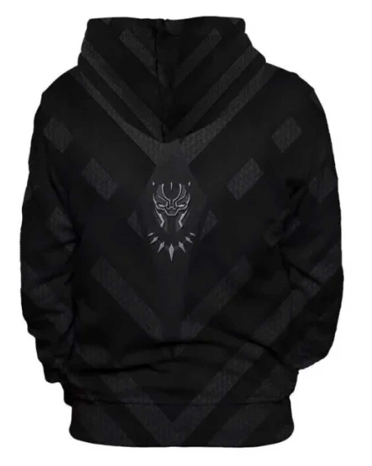 The rib-knitted cuffs and pullover closure enhance its comfort and ease of wear. Presented in an all-black color, this hoodie pays tribute to the Black Panther, making it a fashionable and fitting choice for Halloween celebrations or casual wear.