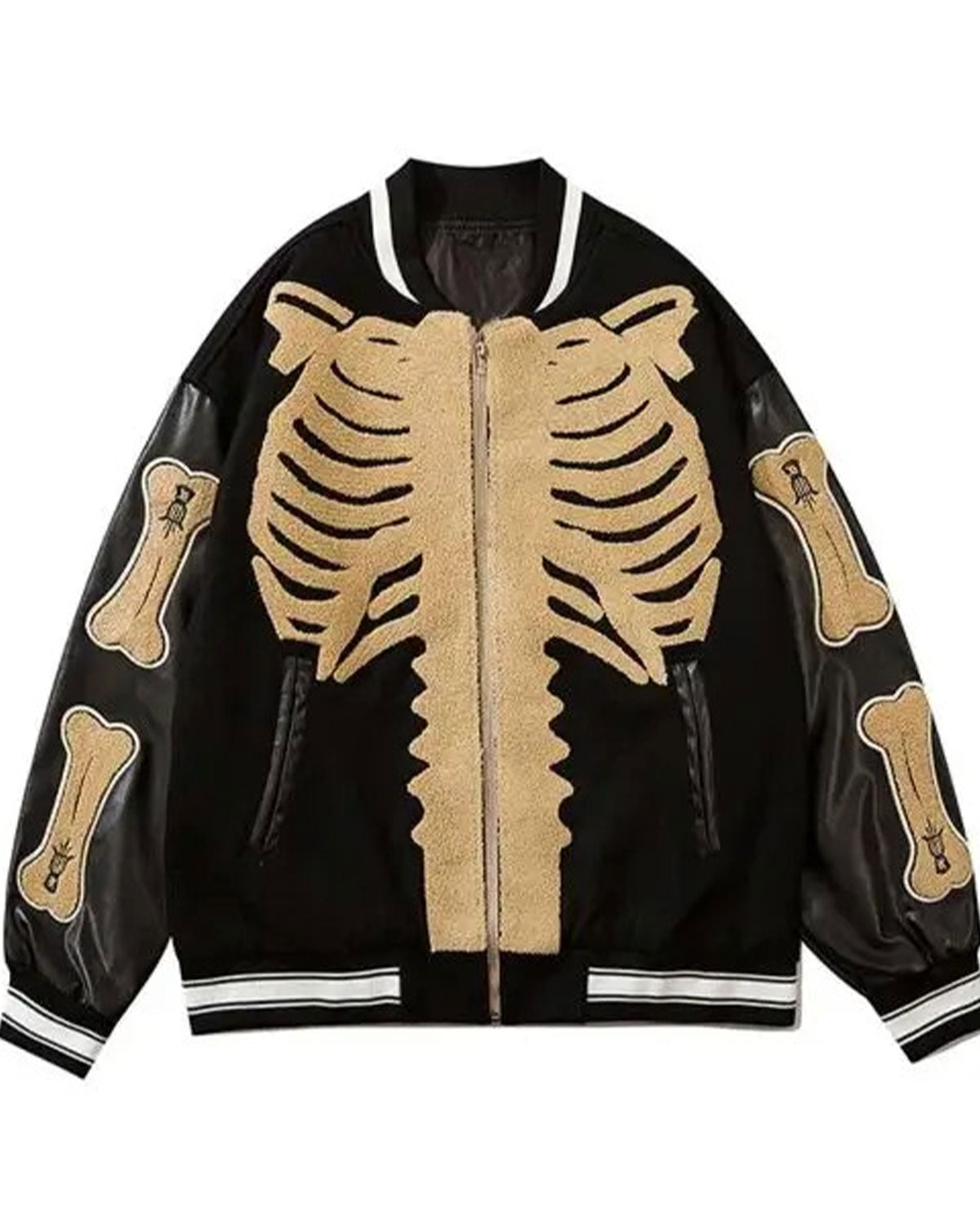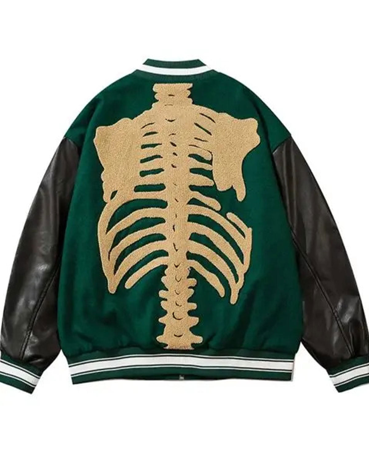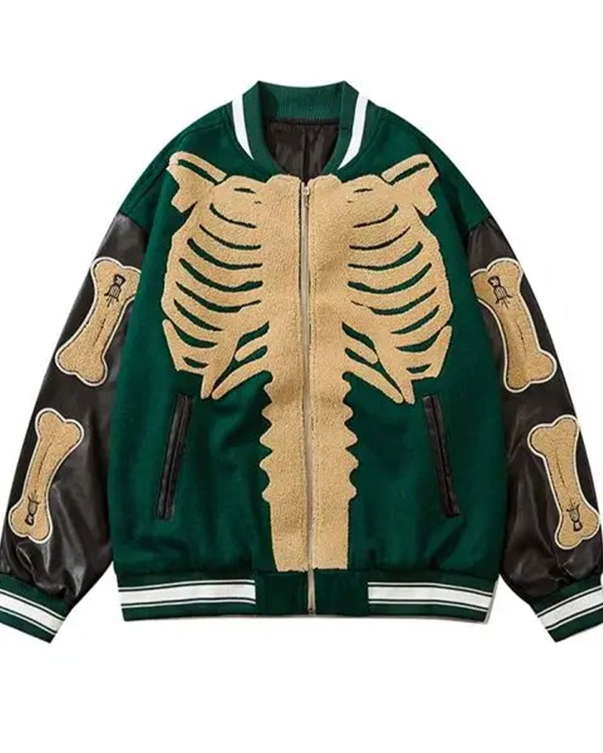 Available in black and gold or black, green, and gold, the color options provide versatility and eye-catching choices. The rib-knitted collar and cuffs add texture and detail, enhancing the overall appeal. The standout feature of this jacket is the skeleton patches appliquéd all over, creating a bold and unique design that is sure to turn heads.