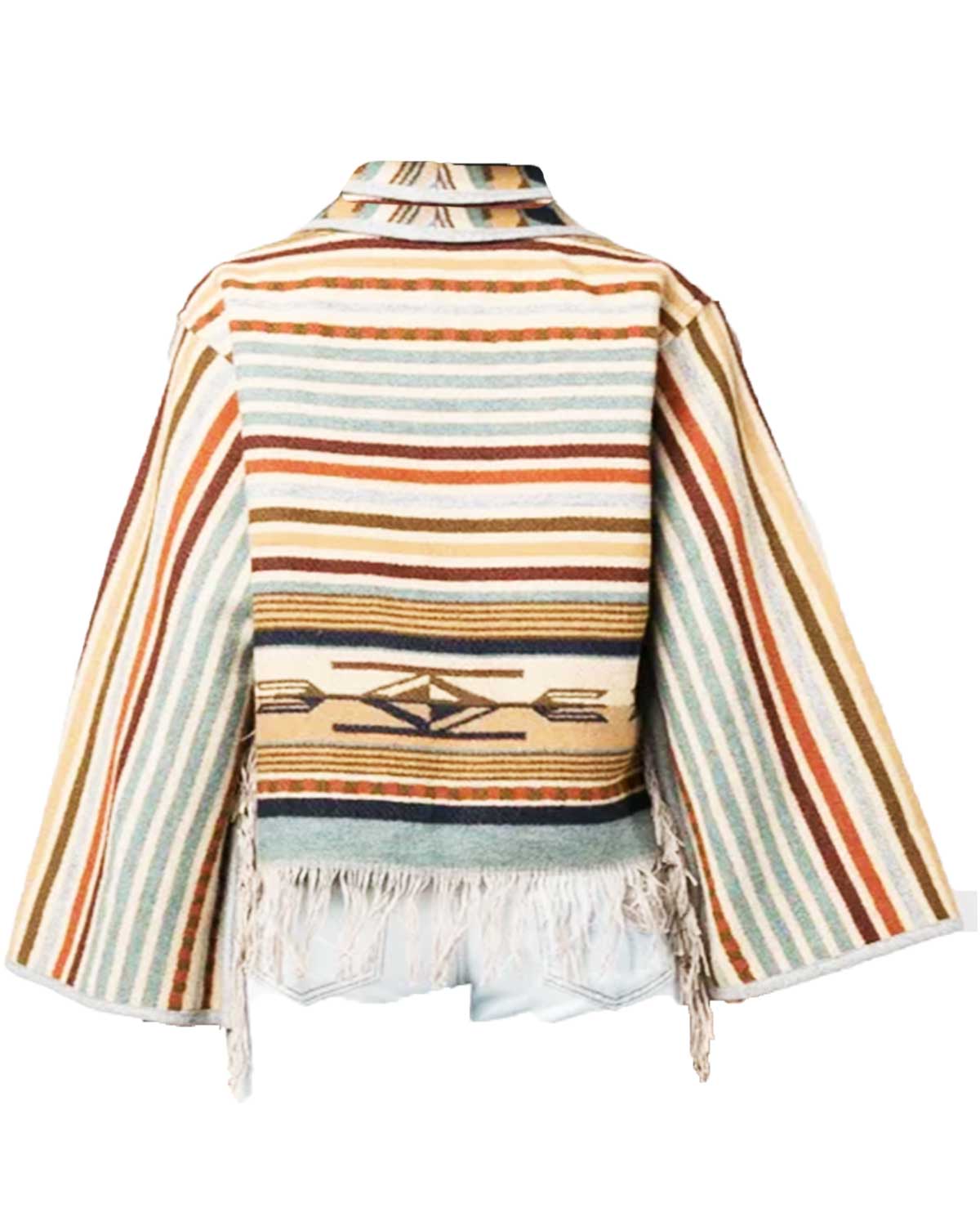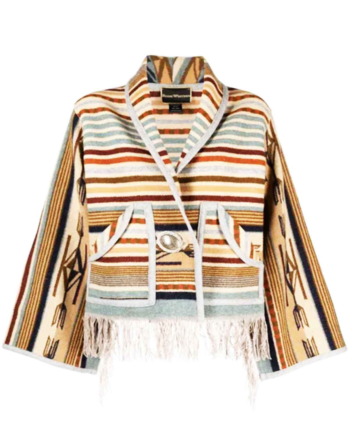 This amazing Glastonbury Multicolor Jacket contains a shortened western fringe design, giving it a distinctive and trendy edge. The shawl collar adds a touch of elegance, while the full-length sleeves and open hem cuffs contribute to its overall attraction.