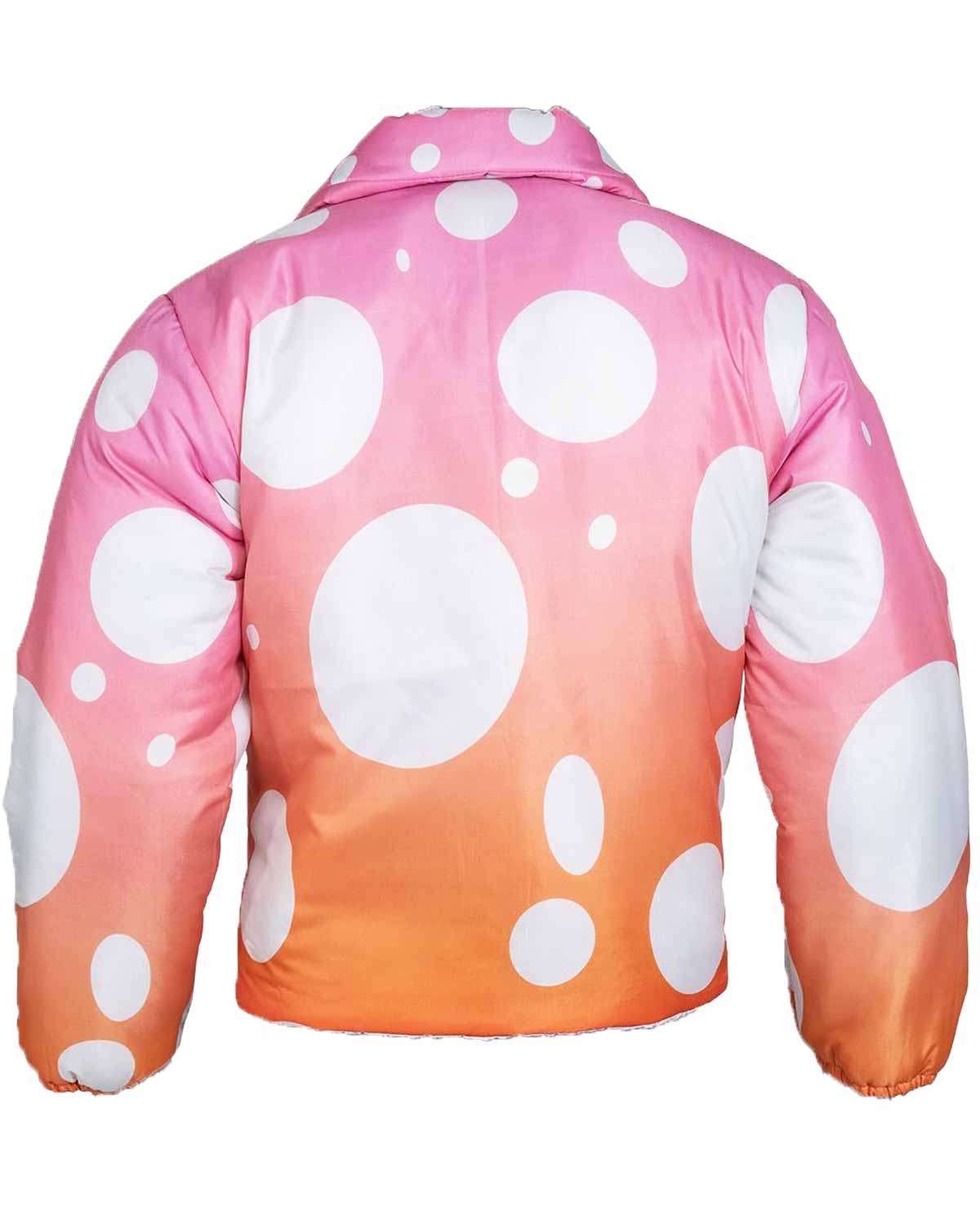 With long sleeves and elastic cuffs, this Justin Bieber Peaches Puffer Jacket combines a trendy look with usefulness. The front open design is secured with a zippered closure. The distinctive pink and orange ombre color scheme adds a bold and fashionable element, making it a standout choice. For functionality, the jacket includes two slant waist pockets on the outside and two inside pockets.