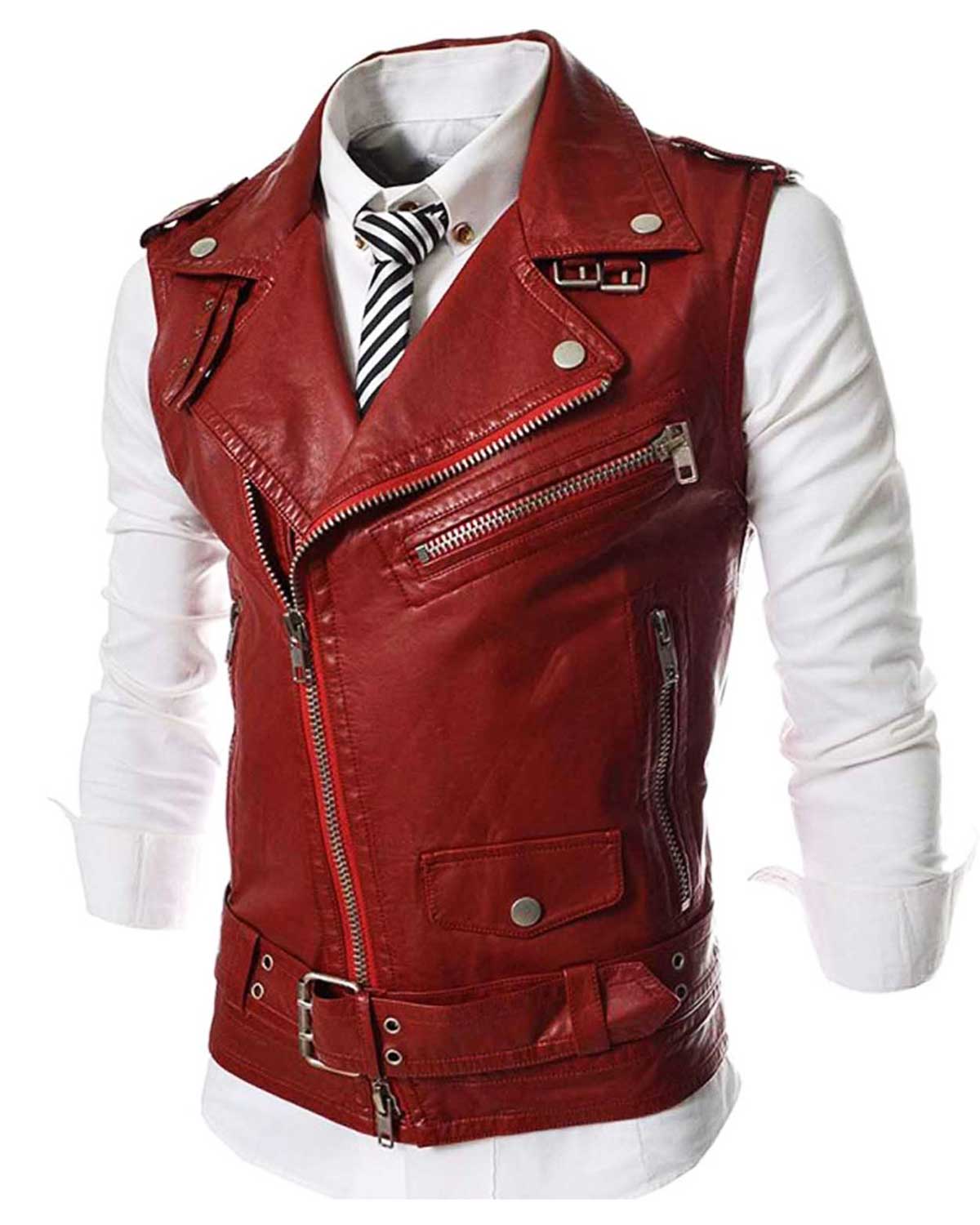 Make a powerful statement with the Men’s Asymmetrical Slim Fit Motorcycle Red Leather Vest. Crafted from real leather, this vest is a perfect blend of style and functionality. The vibrant red color, studded lapel style collar, and asymmetrical zipper closure with buckle straps exude bold elegance.