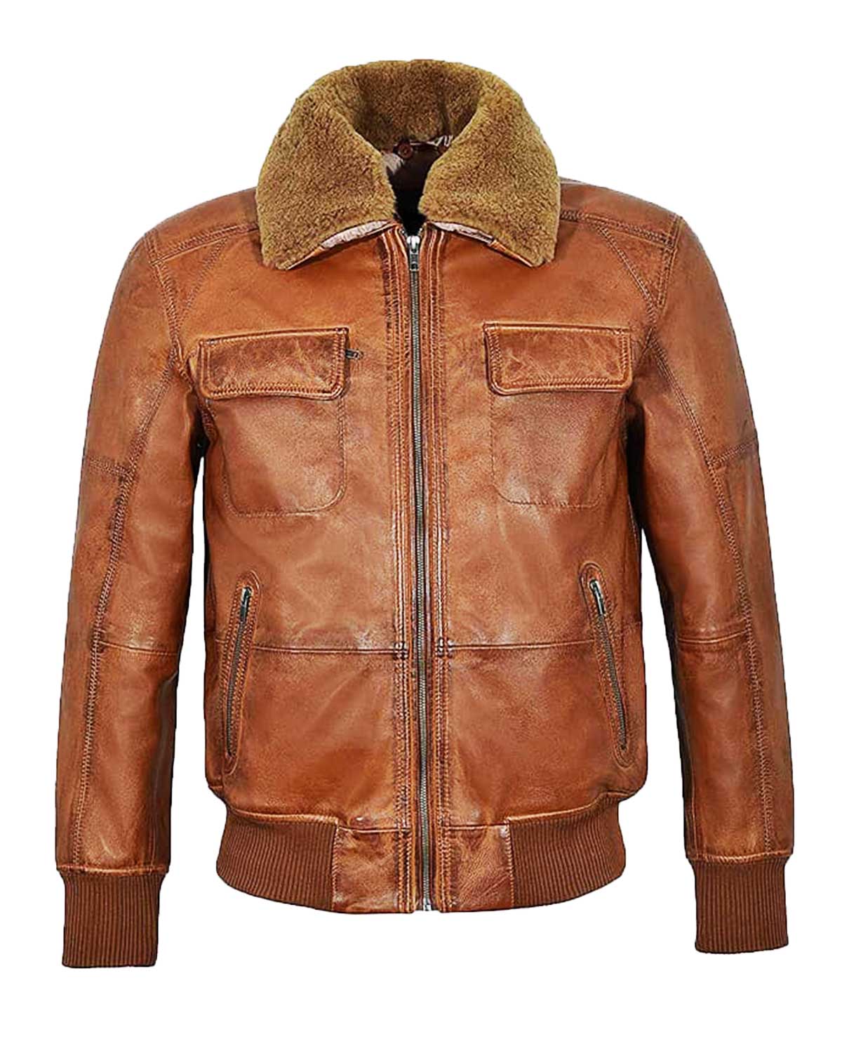 Elevate your style with our Men's Aviator Shearling Bomber Jacket. Crafted from real lambskin leather, it features a removable brown fur collar, full-length sleeves with rib-knit cuffs, and a YKK zipper closure.