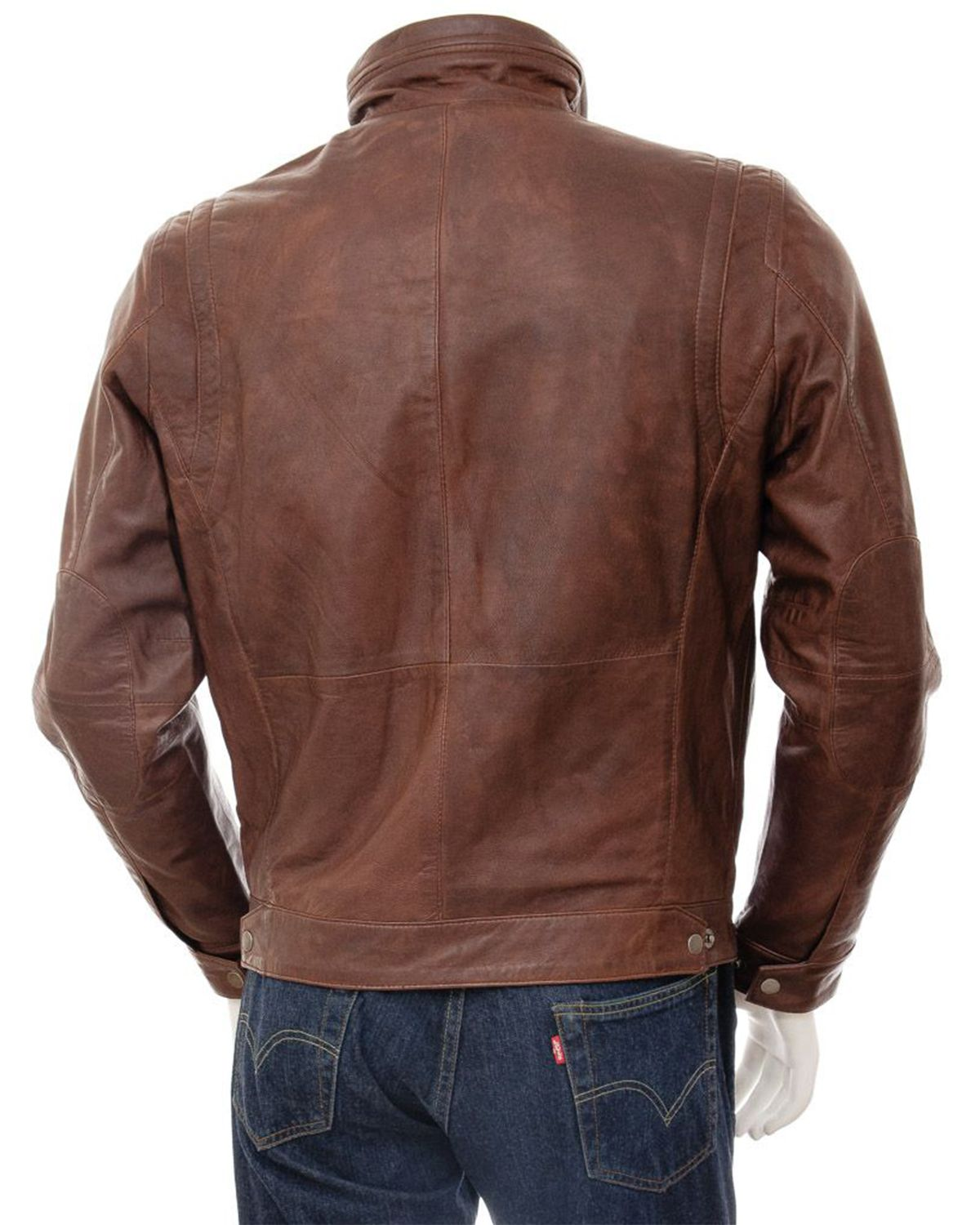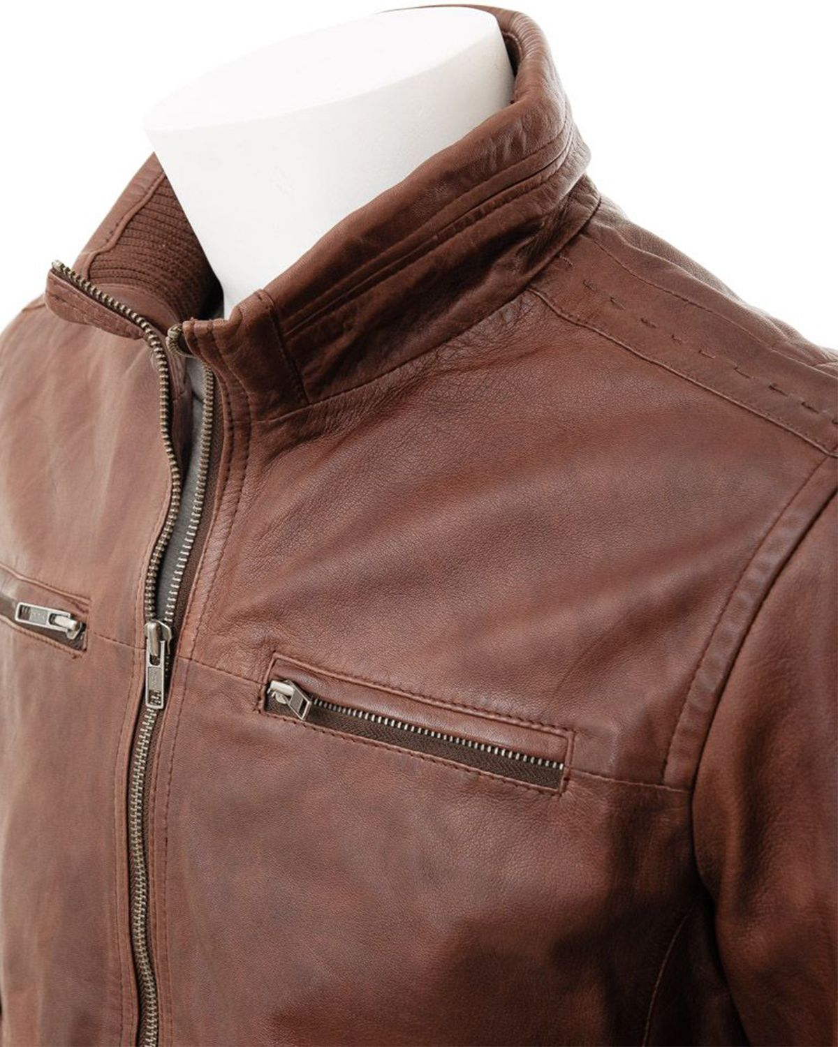 Glowrexs Men's Brown High Funnel Neck Collar Biker Real Leather Jacket - X-Small / Brown