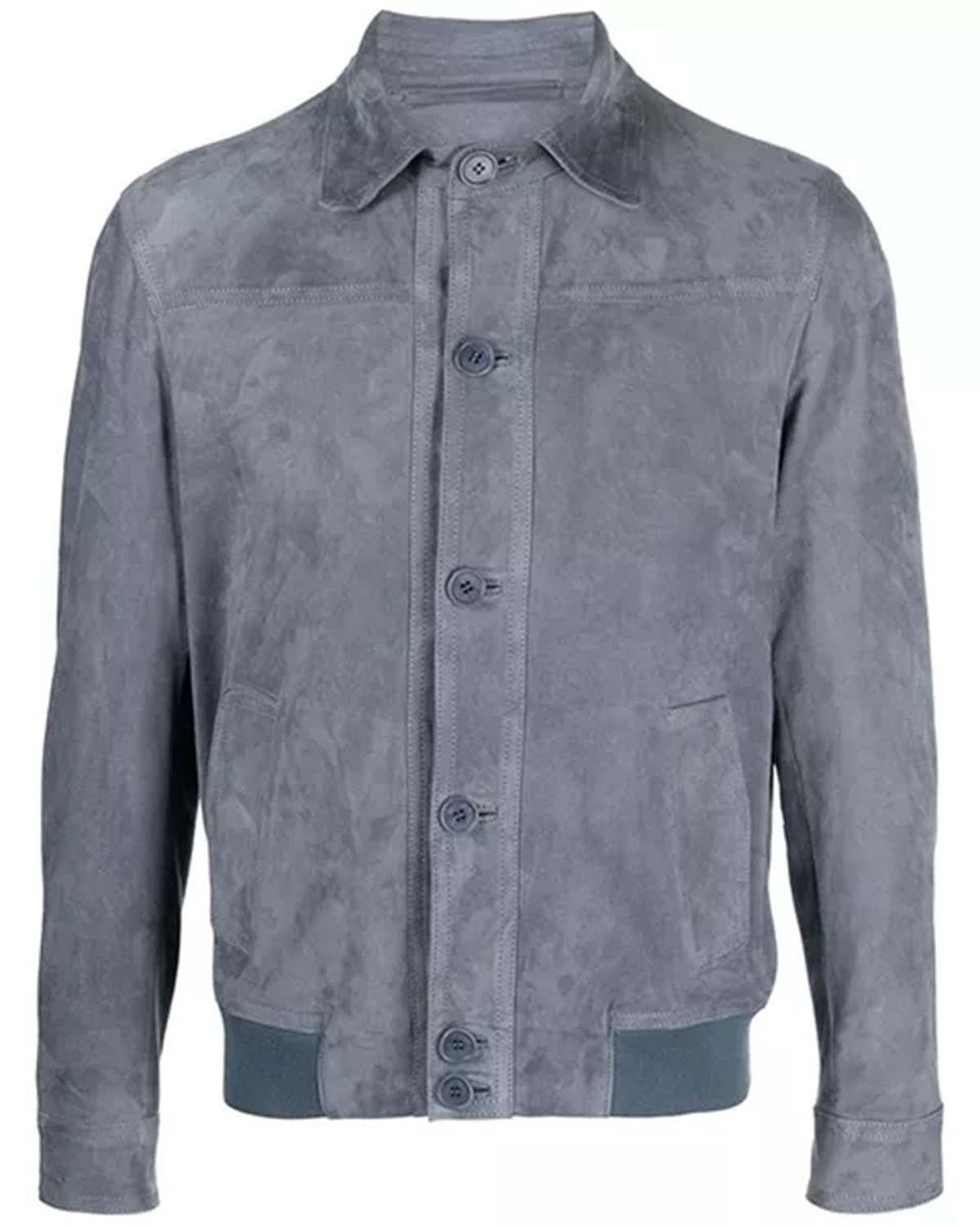 The mens grey suede leather jacket's grey colour gives it a hint of modernism and adaptability, making it appropriate for a variety of situation. This jacket blends comfort and style with its traditional collar, button closure at the front, and rib-knit waist. It offers useful storage capacity choices with two front pockets and one inside pocket. Wearing it is made secure and comfy by the plush inside lining. This jacket, with its long sleeves, is a classic and stylish option for guys.