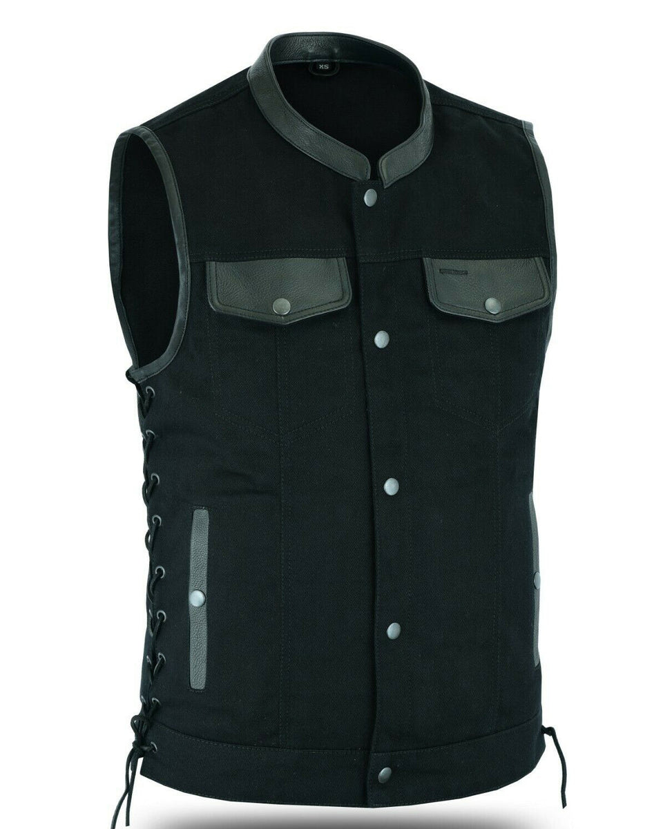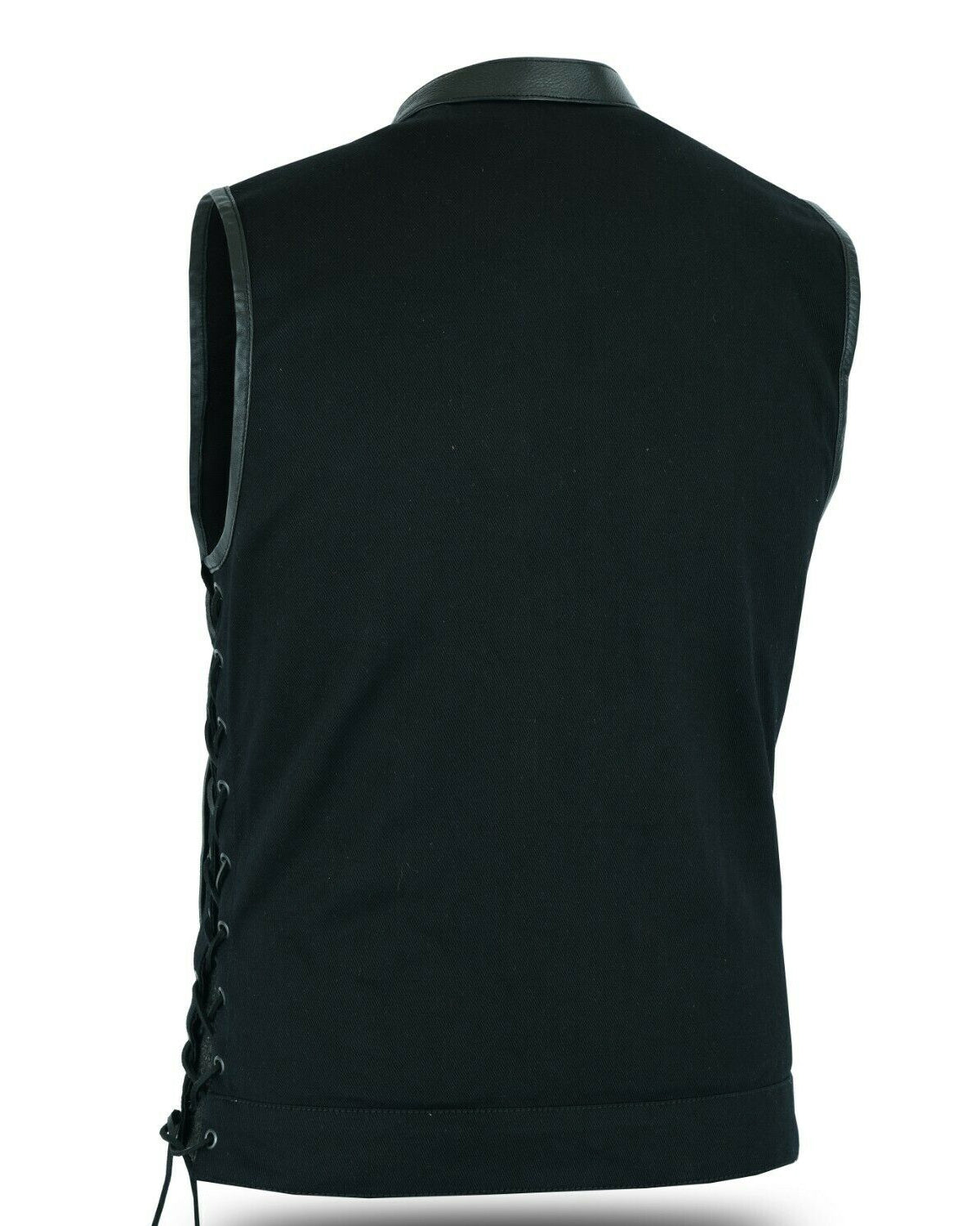 This Ves has a zipper closure that gives the wearer the soft feel of a SOA Club Style Denim Vest made from heavy cotton denim. Milled Leather Trims are used at the pocket flaps, armholes, and waist belts This motorcycle vest is designed with a total of 8 pockets: 2 chest pockets, 2 waist pockets, 2 deep concealed carry pockets, 1 simple and 1 zipped pocket inside the vest, designed and stitched with the dual closure feature. It has front hidden metal snaps and rust rust-resistant zipper to fasten the vest.