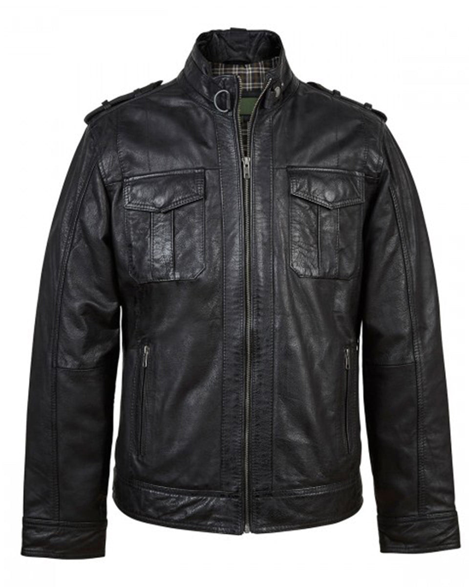 This stand up collar leather jacket contributes to some unique features like stand up buckle fasten collar that can be worn up or down ,two easy access zip fasten front pockets,two stud fasten breast pockets,epaulet detail on shoulders,