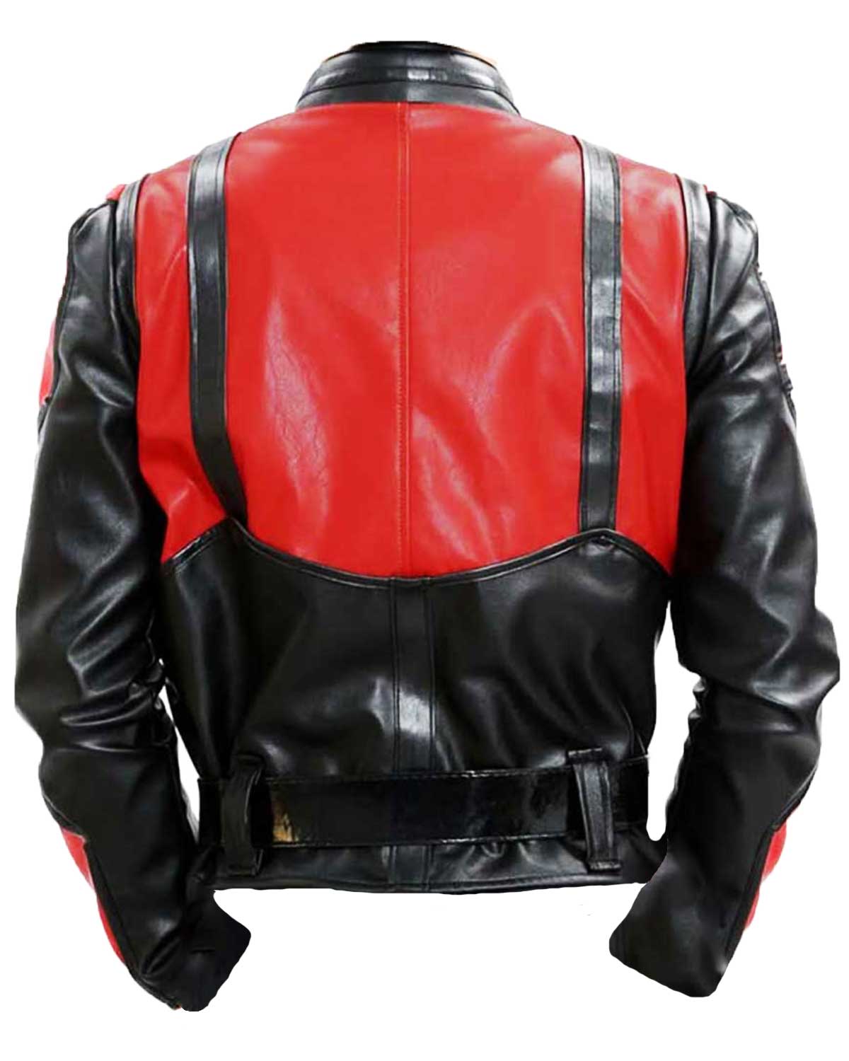 The red and black color combination, YKK branded zip closure, and standup collar style create a sleek and dynamic look. The red embossed deltoids and fine detailing in stitching add a touch of superhero flair. The adjustable belt at the waistline enhances the silhouette, while open hem cuffs complete the ensemble.