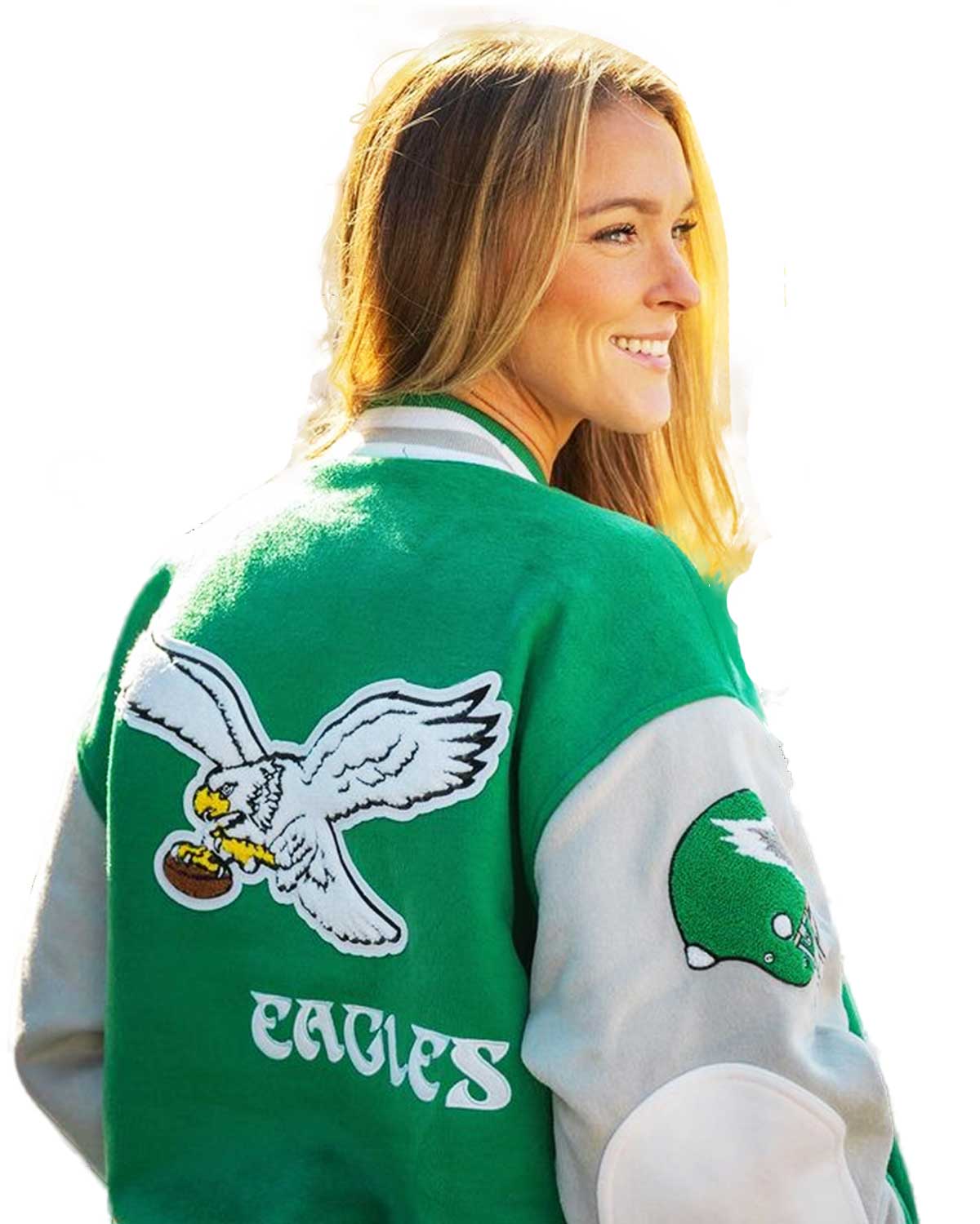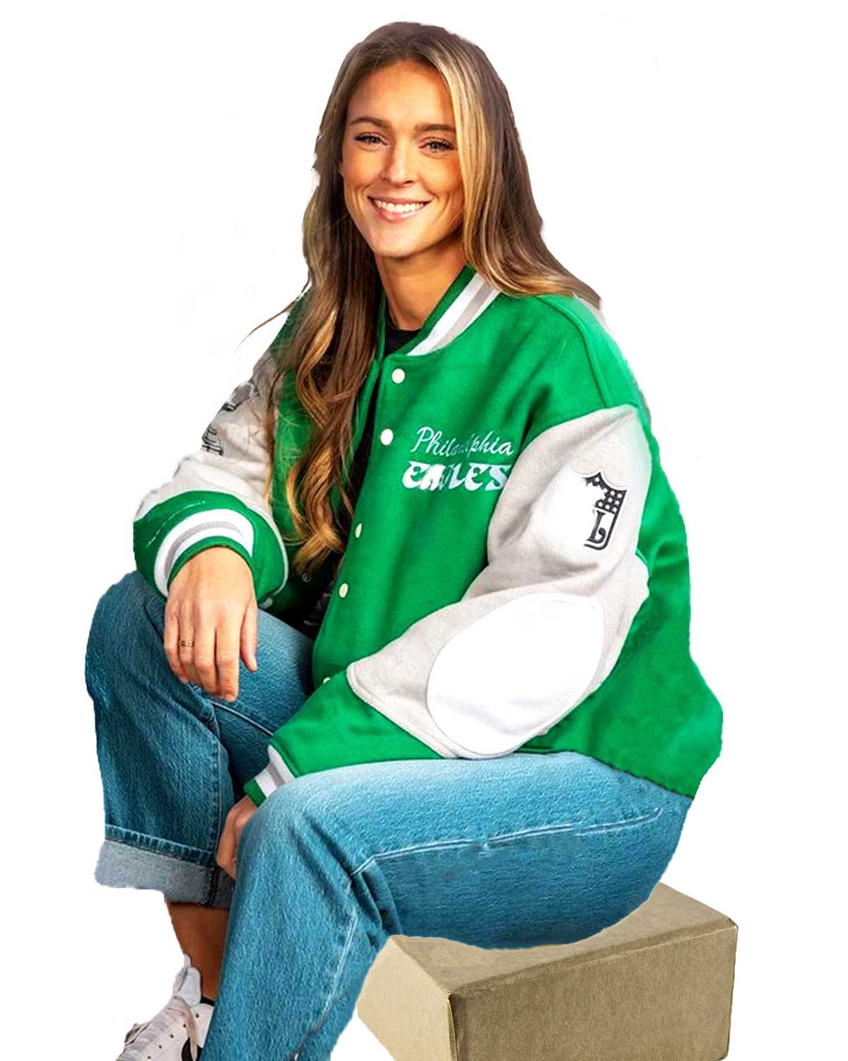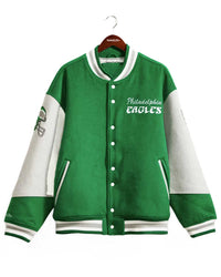 The rib-knitted style collar adds a hint of sporty appeal and enhances the overall aesthetic. With full-length sleeves and rib-knitted cuffs, Philadelphia Eagles Jacket presents a sleek and polished silhouette. Embrace the bold color combination and make a fashion statement with this exceptional piece, designed to enhance your style and provide warmth and comfort throughout the day.