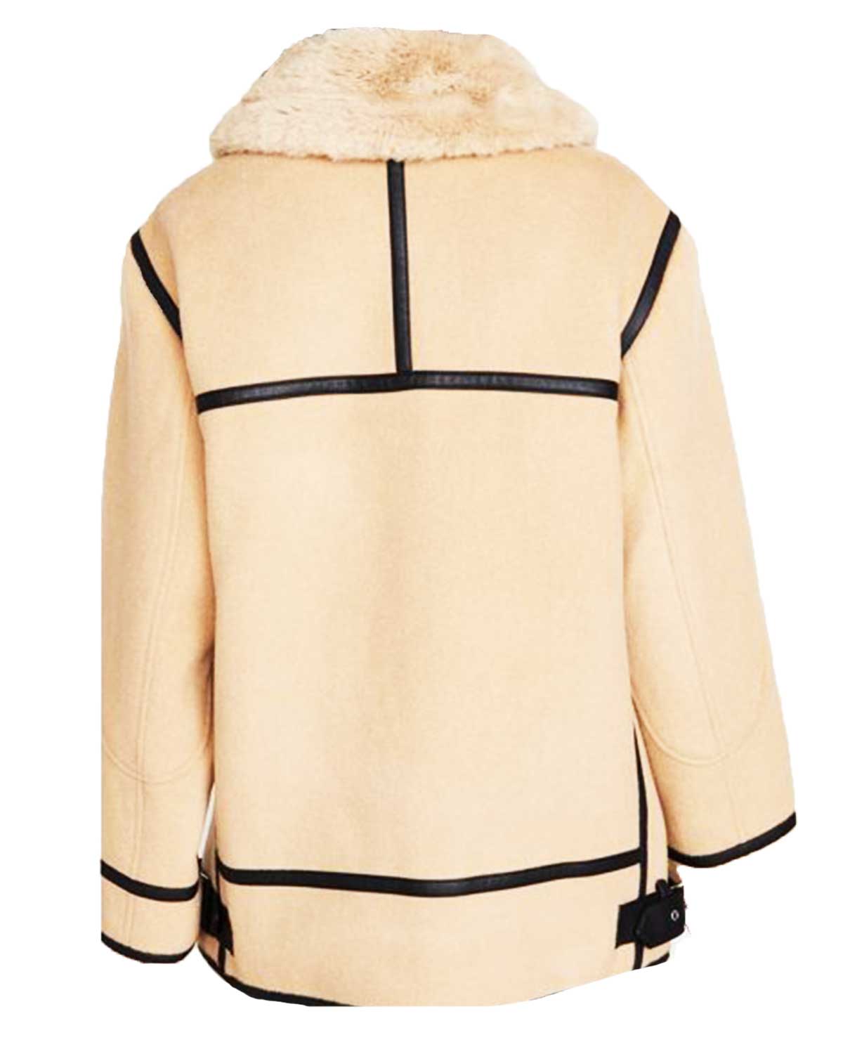 Featuring a zipper style closure adorned with buttons, the front exudes a perfect blend of functionality and fashion. The full sleeves with open hem style cuffs showcase meticulous attention to detail, while the shearling shirt style collar adds a touch of timeless elegance. Two front side waist zipper pockets provide both utility and a chic edge, making this jacket a universal wardrobe basic.