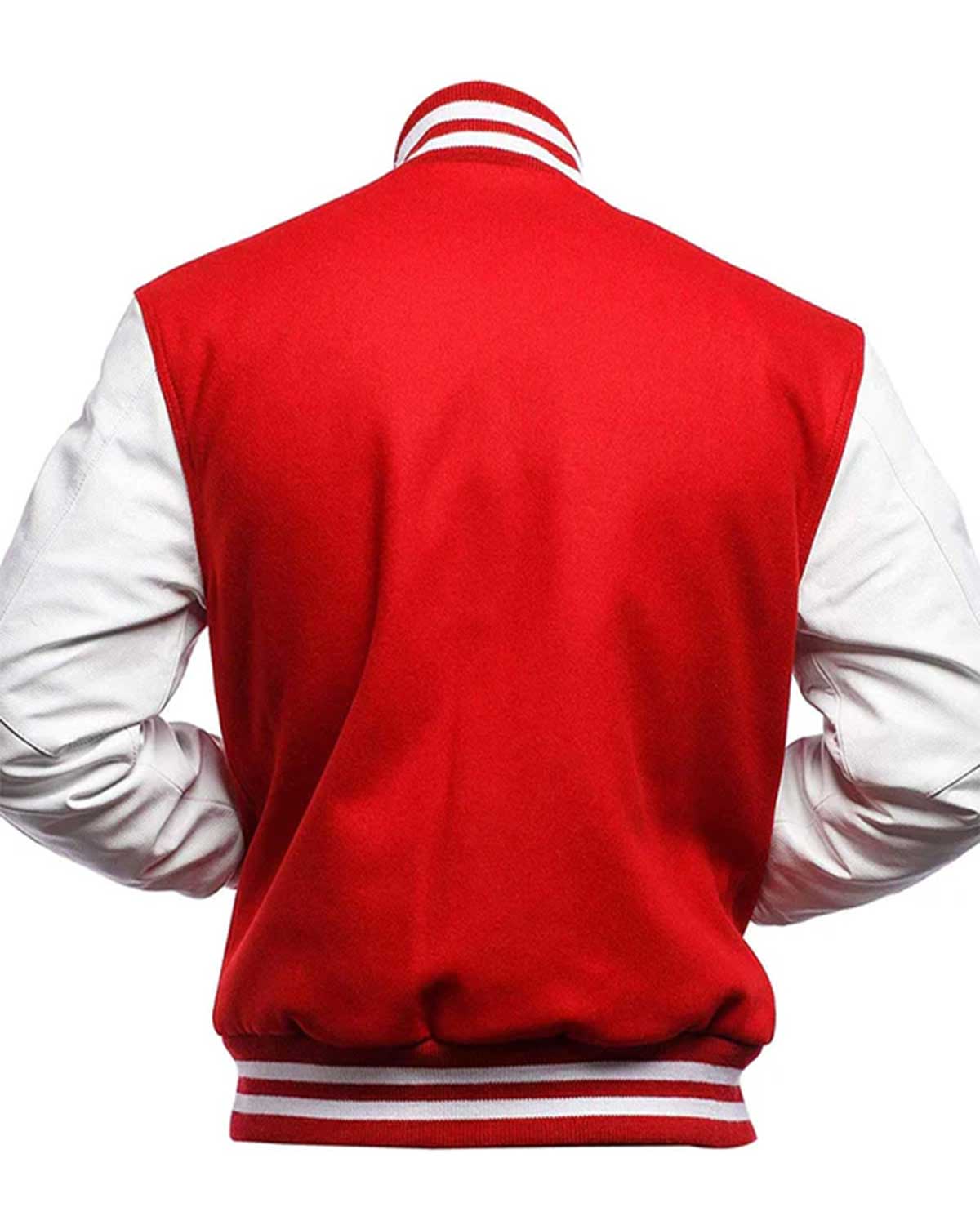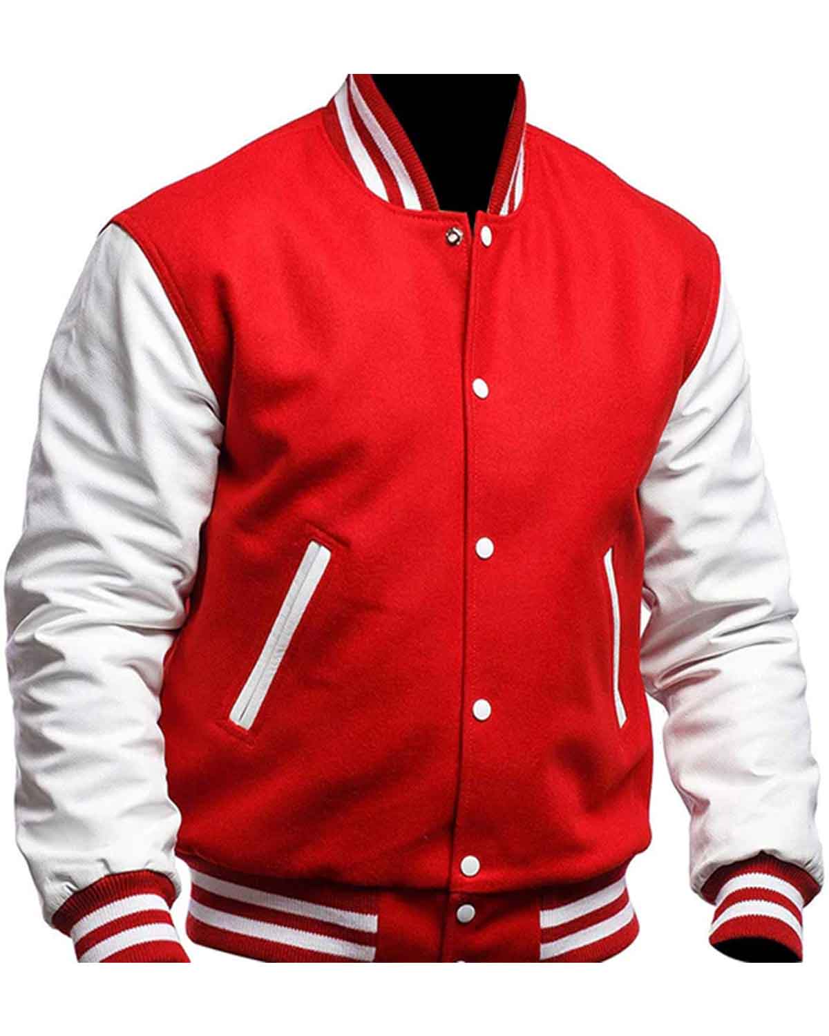 Perfect for a casual and athletic look, the Red and White Baseball Jacket features a front zipper closure for easy wear.