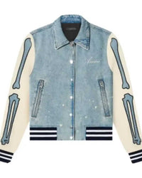 Upgrade your Halloween style with the unique theme Skeleton Varsity Denim Jacket. In a striking blue and white color combination, this jacket is a perfect blend of spooky and chic.