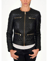 Presenting the smart and modern option for women: the Women Slim Fit Black Quilted Biker Jacket. This black jacket is made of real leather or replica leather, depending on the material choice. Two side pockets and two chest pockets, both with zips closed, offer practicality and a fashionable look, while the front zip closure and round neckline lend an updated feel.
