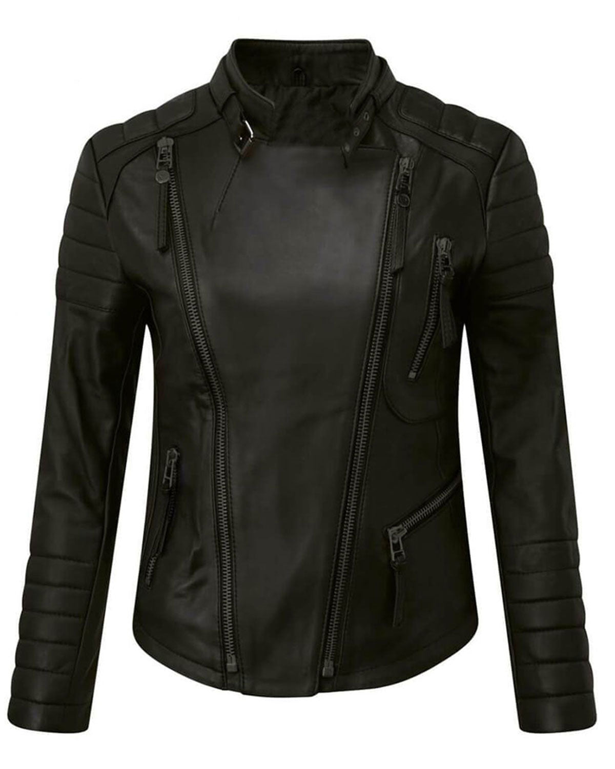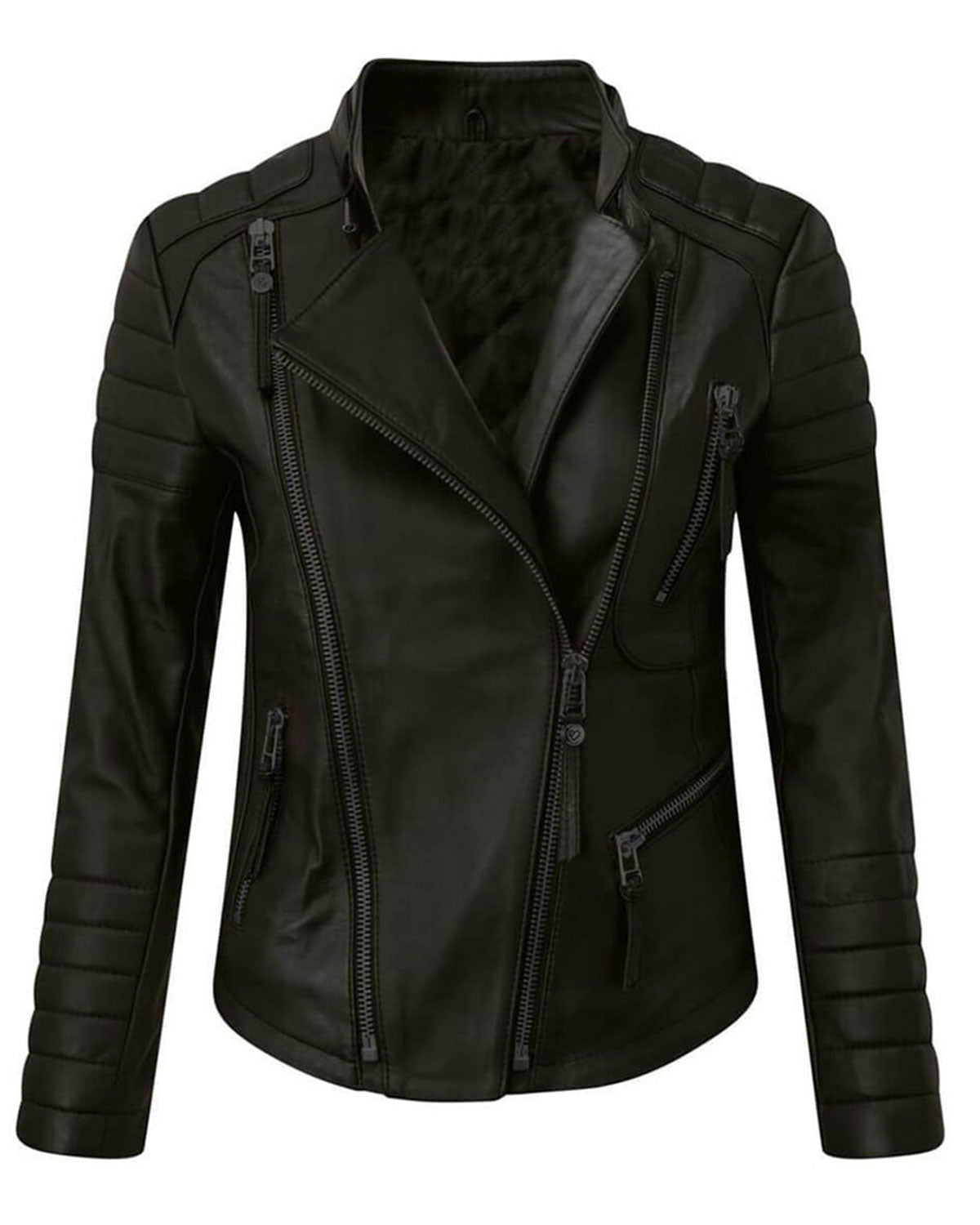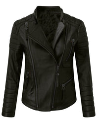 Introducing the Women's Biker Stylish Leather Jacket—a model of modern fashion and quality craftsmanship. This black leather jacket, designed for women, boasts a sleek zip closure on the front for a trendy look. The viscose lining ensures both comfort and a luxurious feel against the skin.