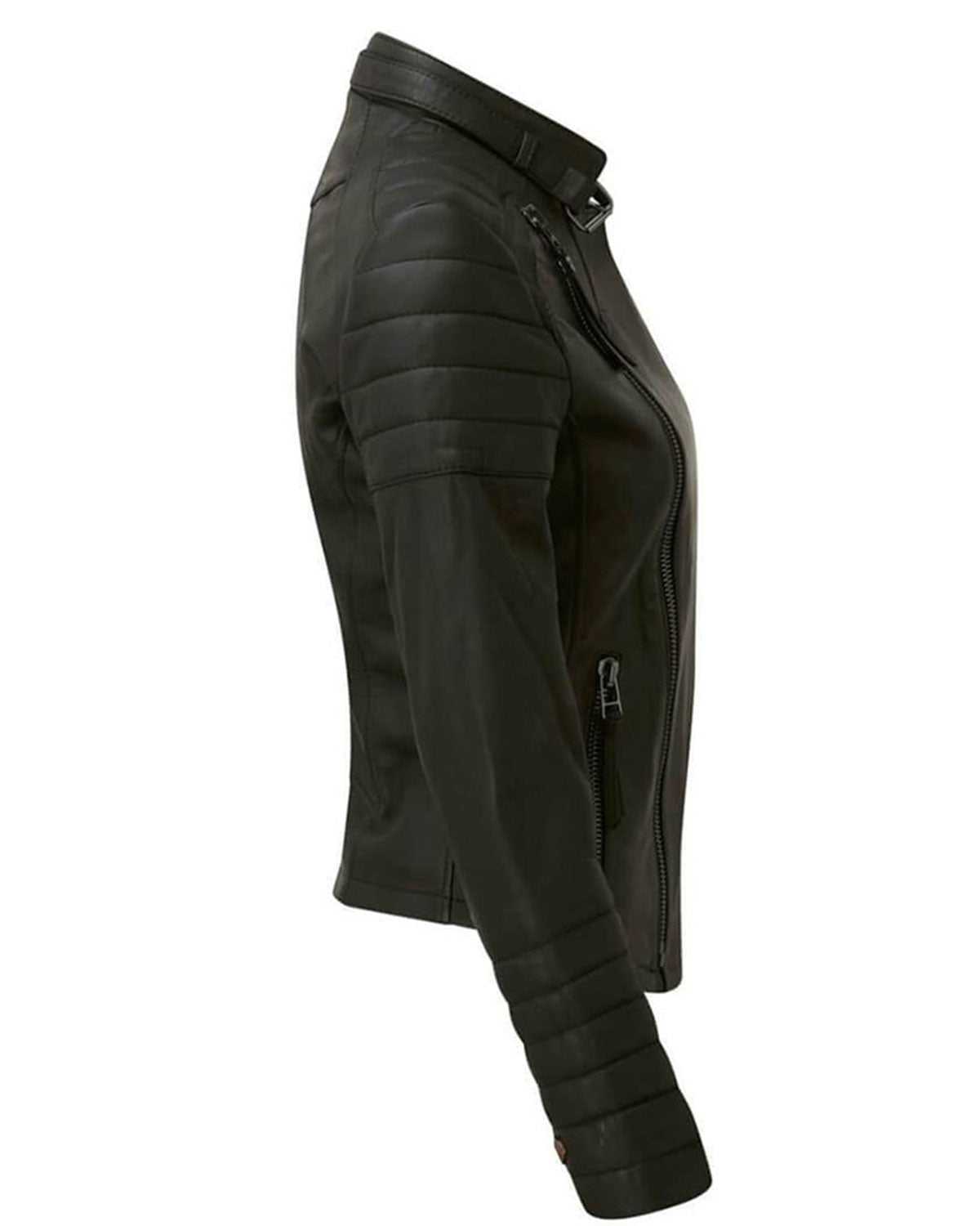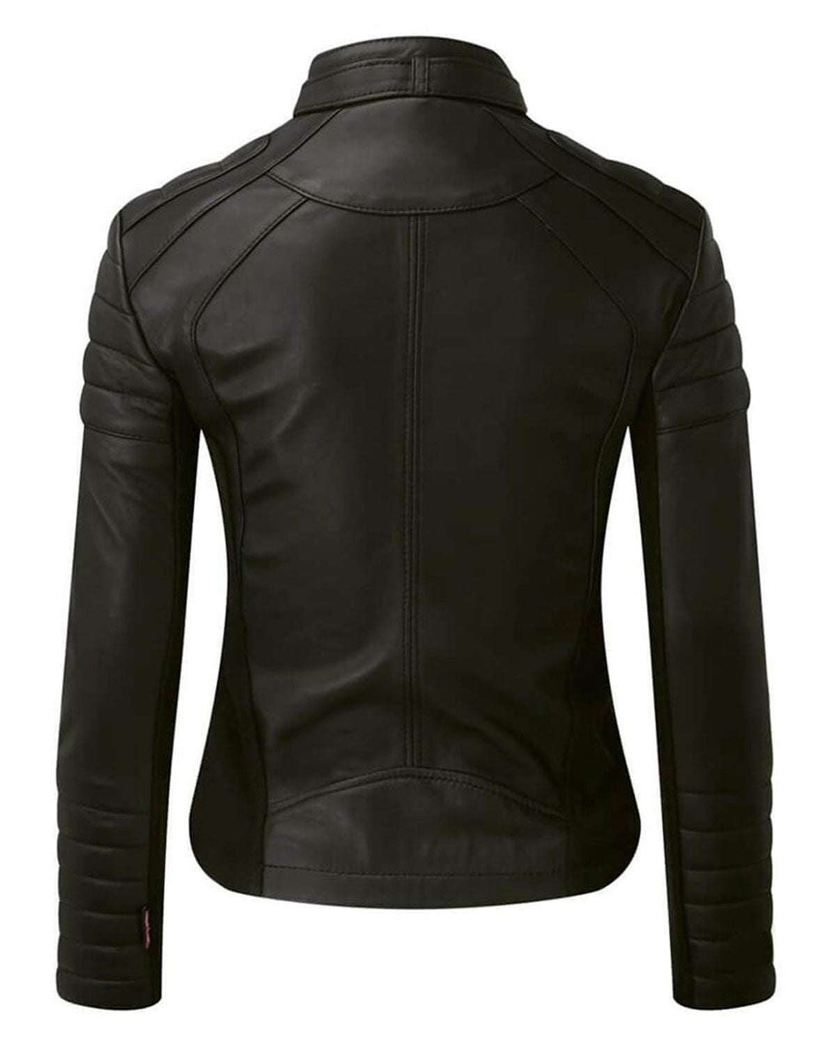 With premium-quality stitching, this jacket not only exudes style but also reflects a commitment to excellence in craftsmanship. Elevate your wardrobe with this chic and timeless black leather jacket, offering a perfect combination of fashion and durability for the modern woman.