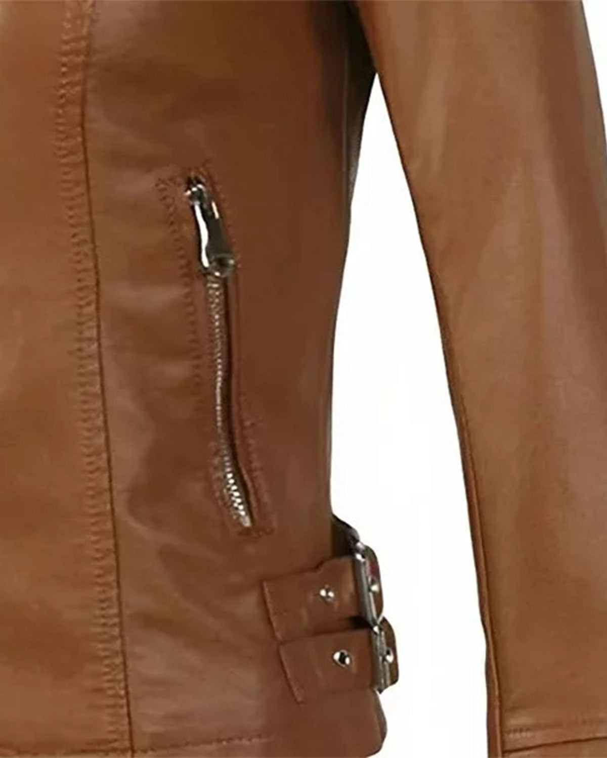Presenting a casual and effortlessly trendy option: the Women's Brown Motorcycle Leather Jacket. This jacket is made of rich brown faux leather and has a useful zip closure for ease of use. A touch of competence is added by the Mandarin Chinese collar, and traditional coverage is provided by the full sleeves.
