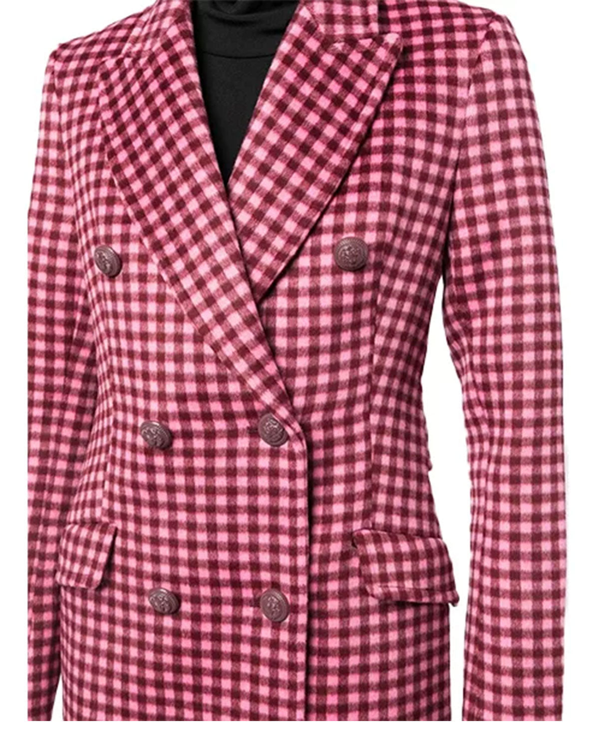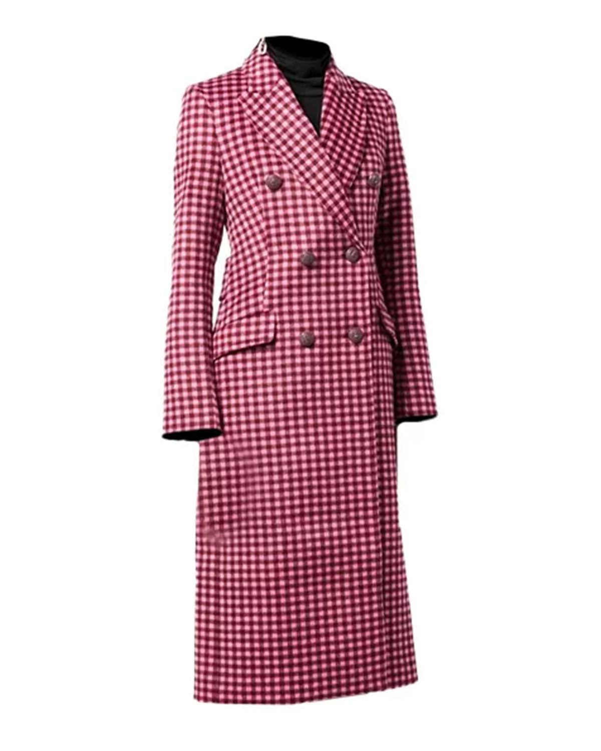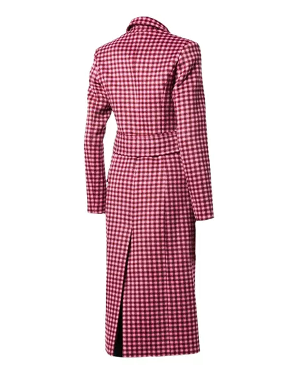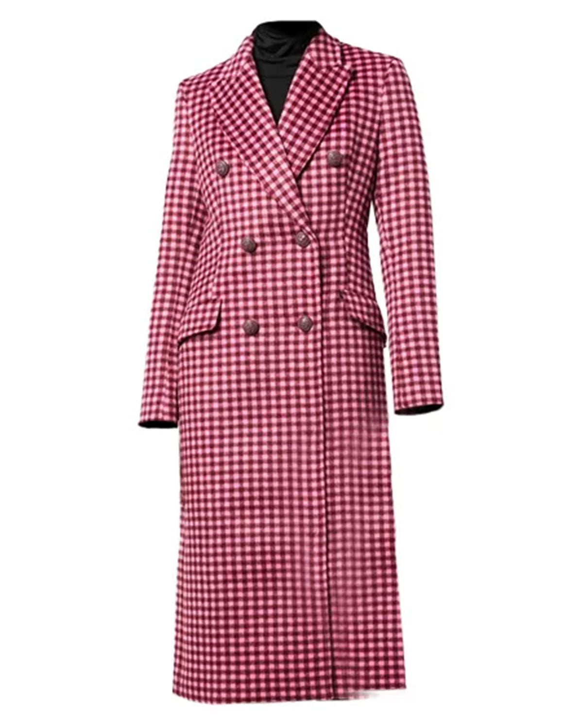 The coat features slant front pockets for added functionality and is adorned with detailed buttons that add a touch of complexness to your look. Wear it as a statement piece layered over your favorite knit dress for a fashion-forward ensemble. Embrace the charm of the season with this Pink Plaid Wool Coat for women, where modern design meets timeless elegance.