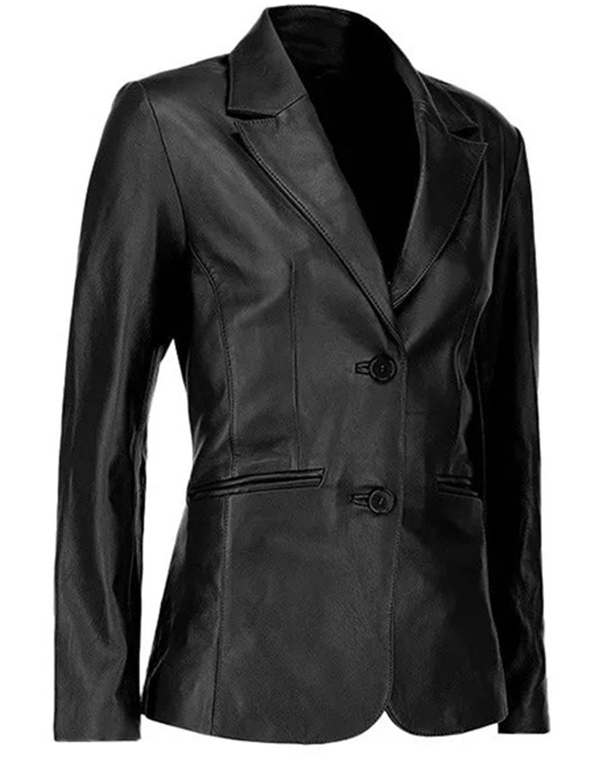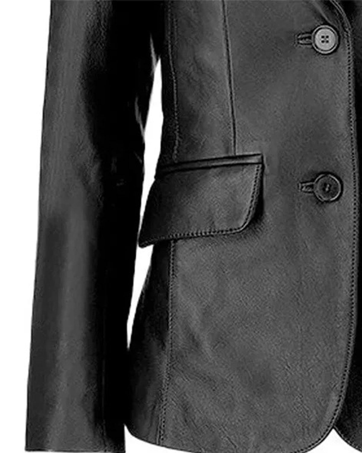 Two front pockets and two inner pockets provide practicality without compromising the blazer's clean and timeless appearance. The open hem cuffs contribute to the overall classic design, making it a versatile and chic addition to your wardrobe. Elevate your style with this Black Leather Two Button Blazer Women, perfect for both formal and casual occasions.