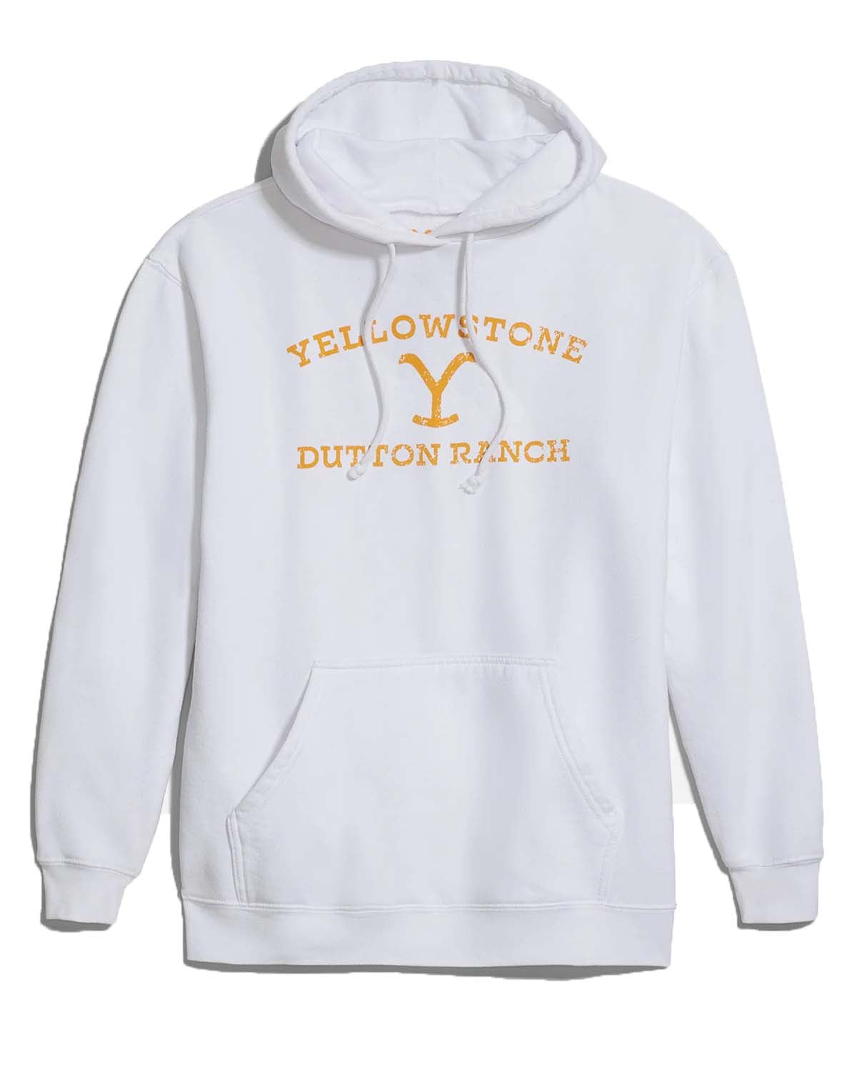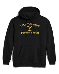 The Yellowstone Ranch Hoodie has a classic design with a drawstring hood and kangaroo pocket. It also features an embroidered Dutton Ranch logo on the front chest.